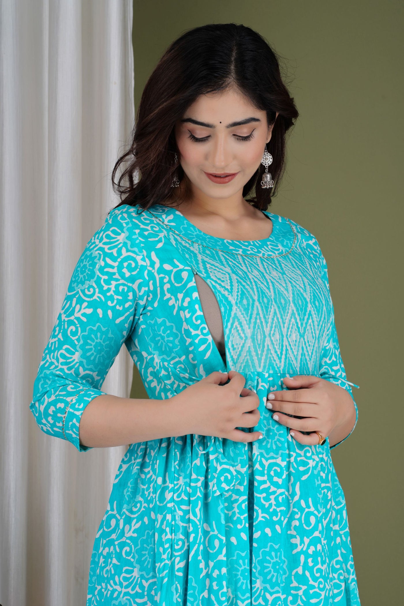 Aqua Blue Printed Pure Rayon Mateniry And Feeding Kurta