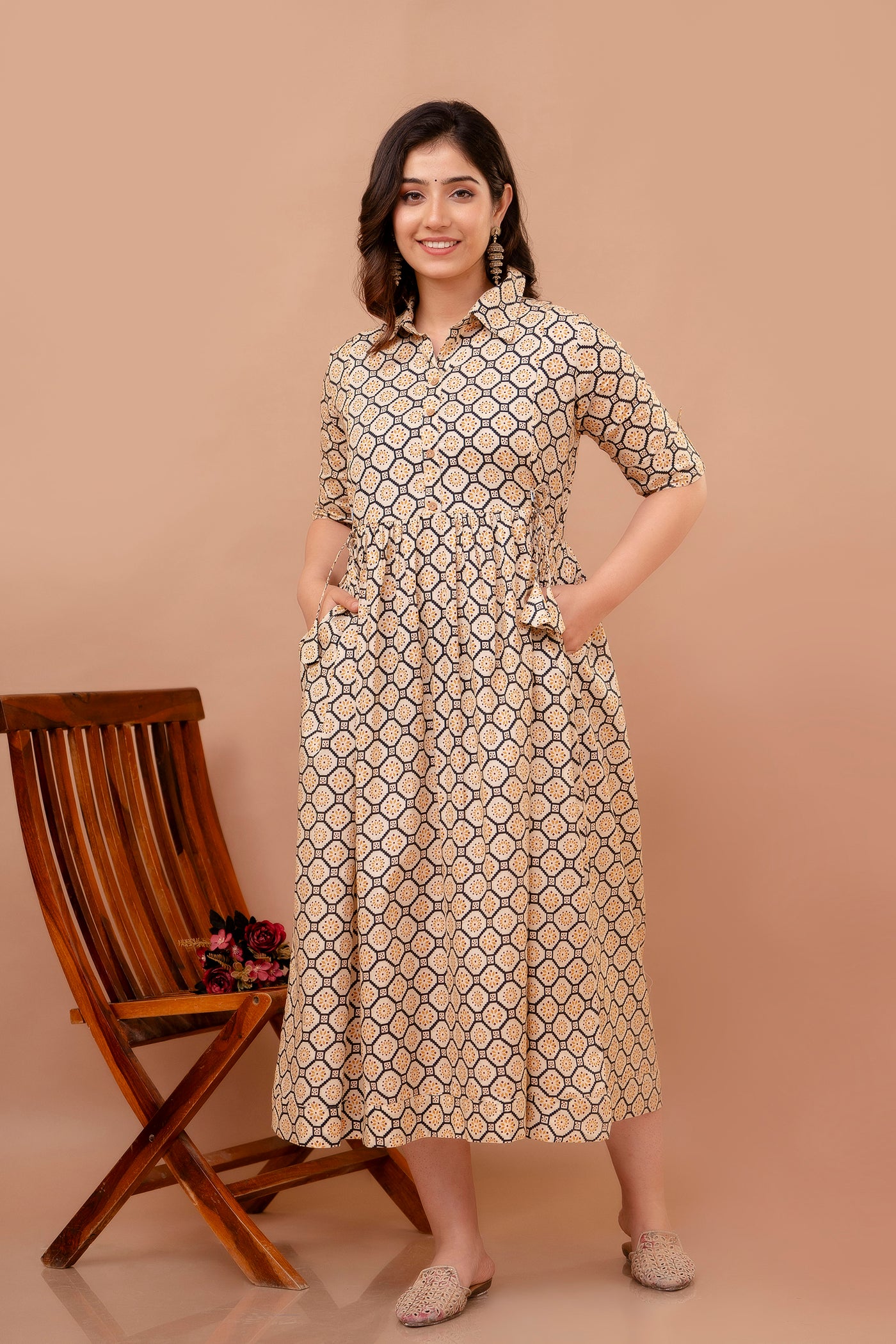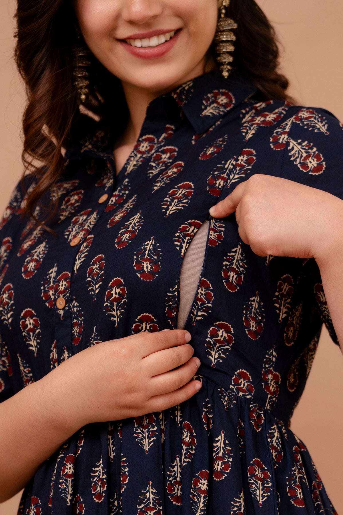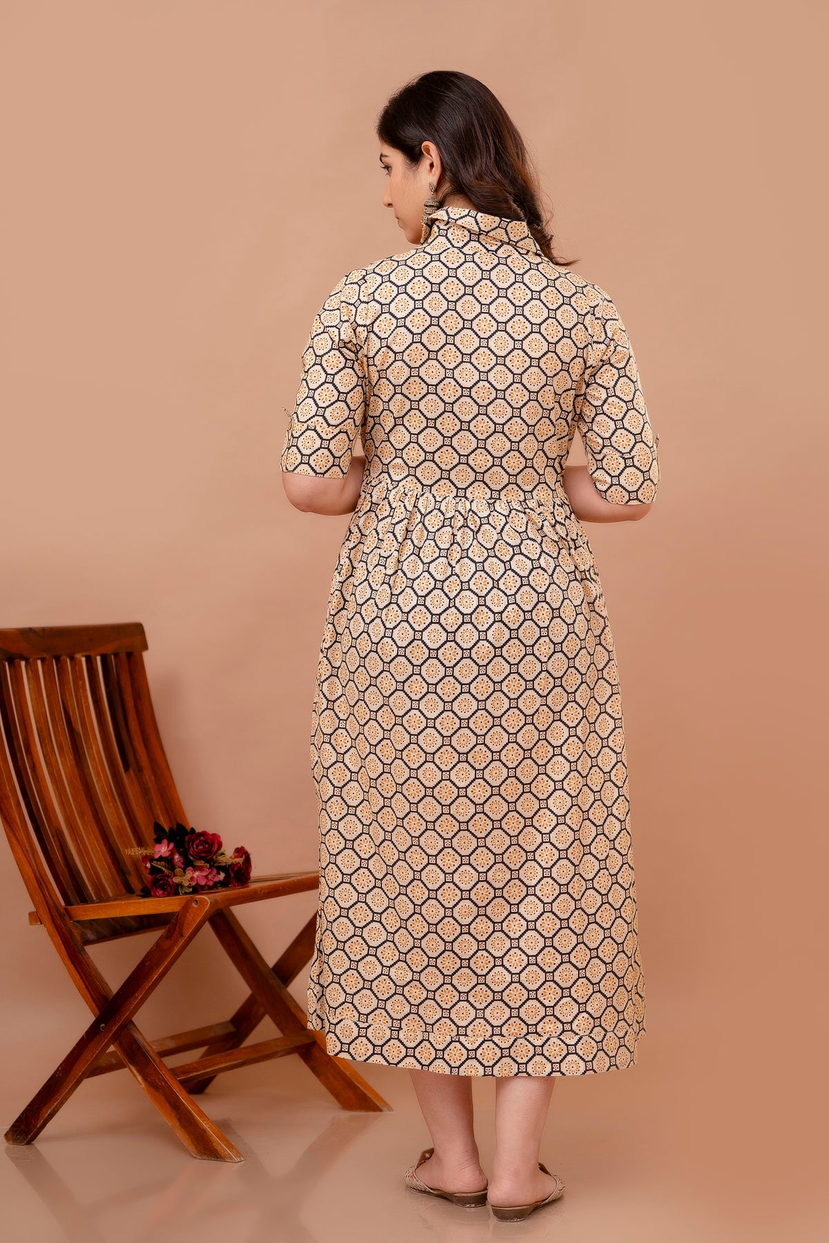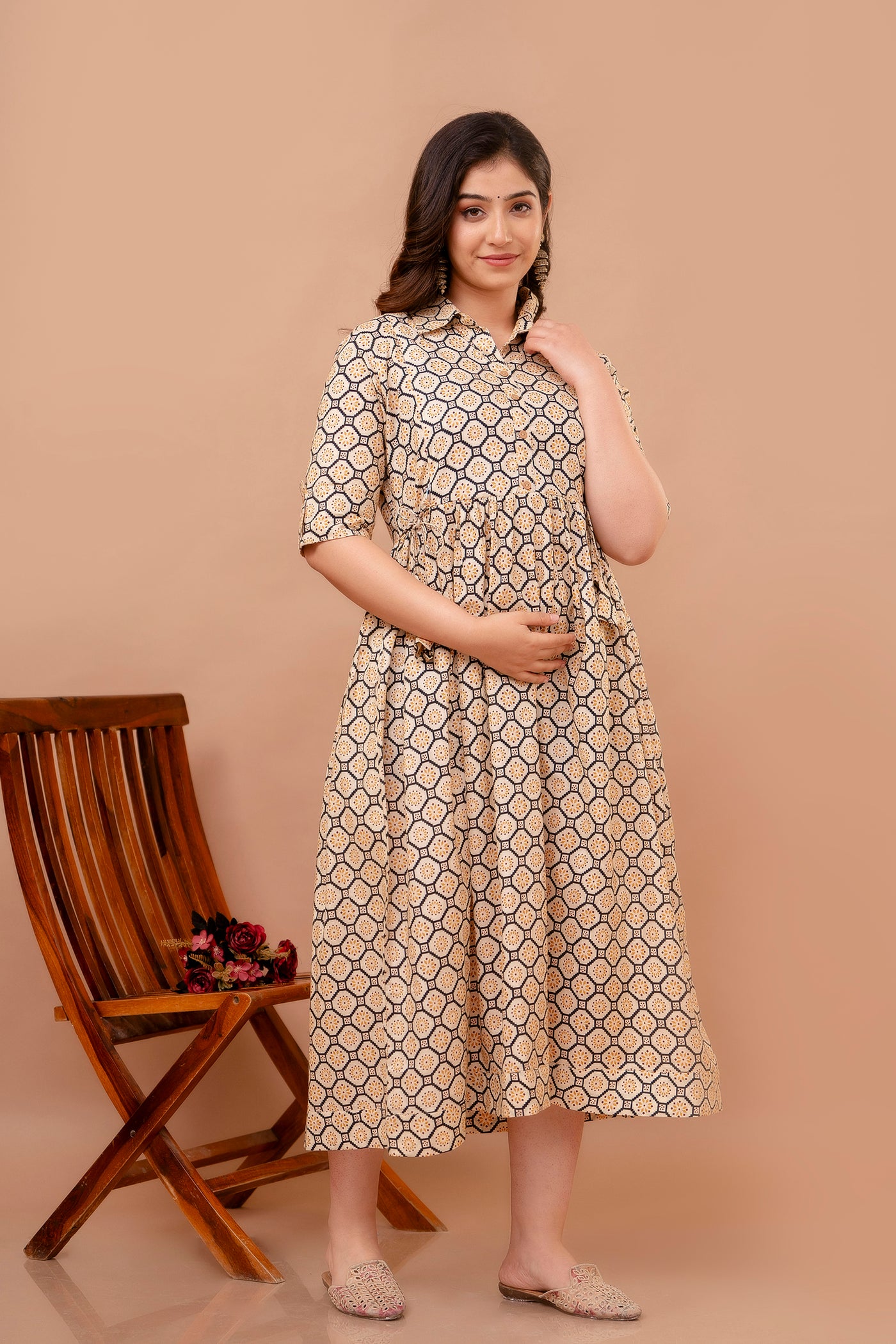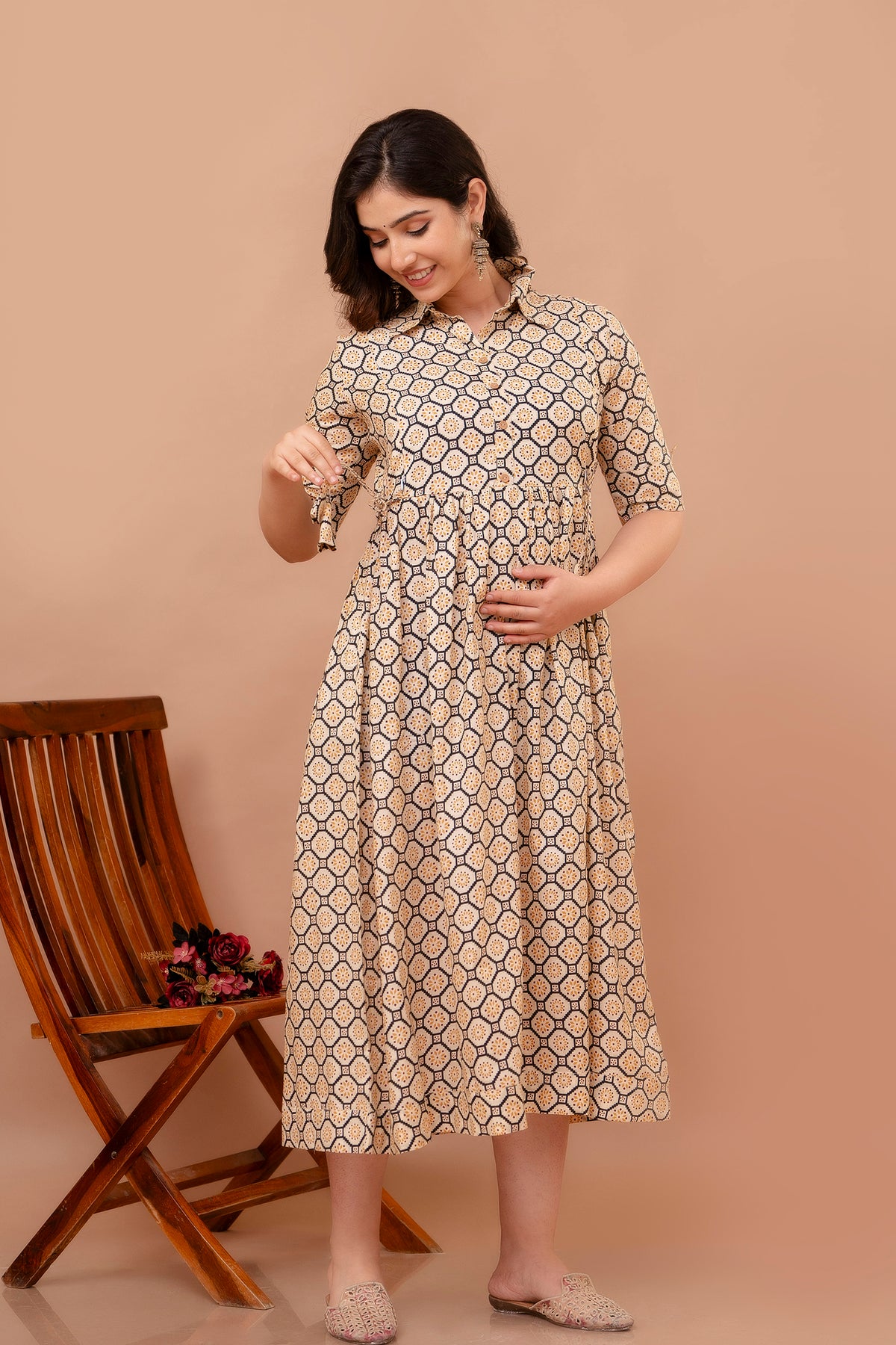 Beige Printed Pure Rayon Cotton Collar Maternity And Feeding Kurta