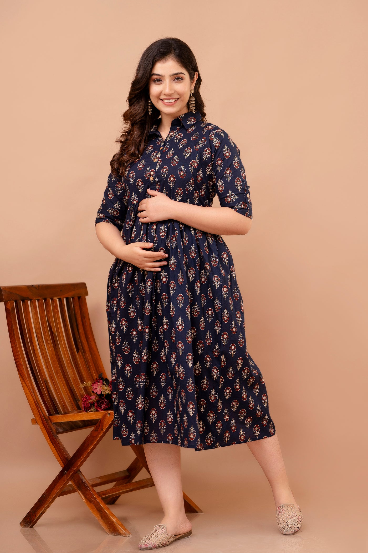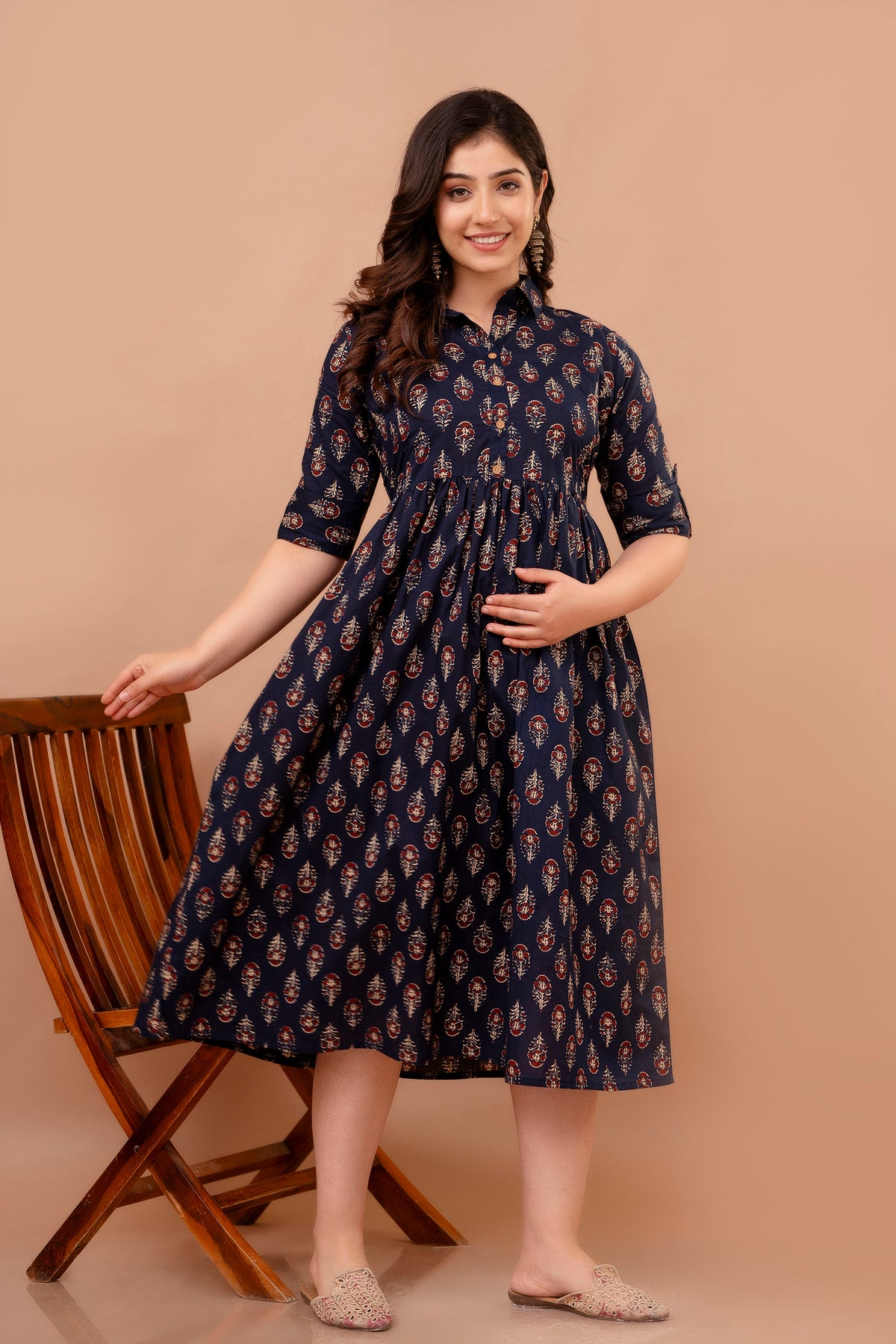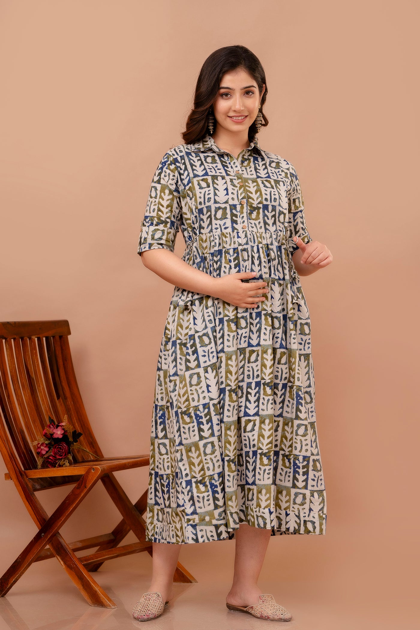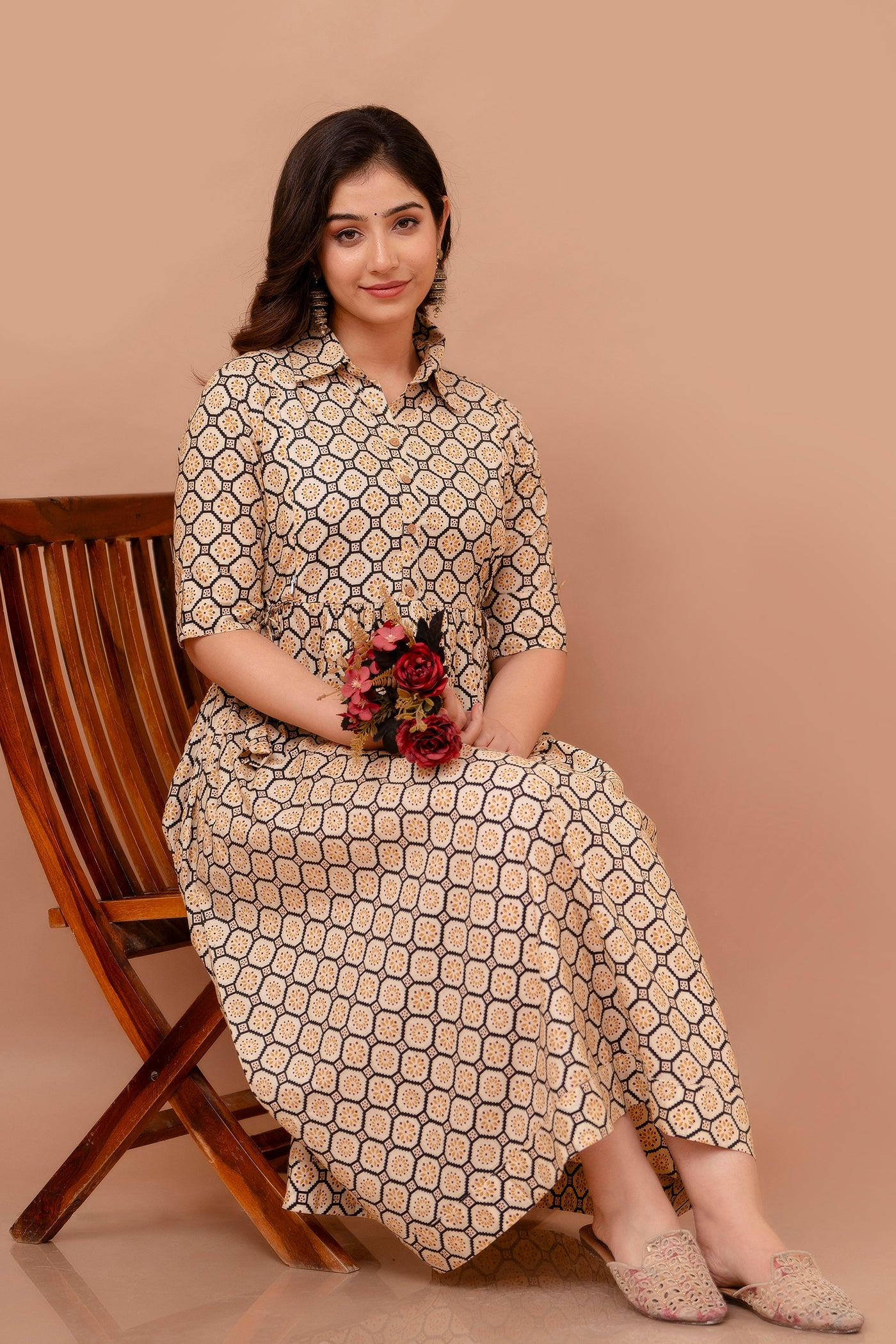Beige Printed Pure Rayon Cotton Collar Maternity And Feeding Kurta