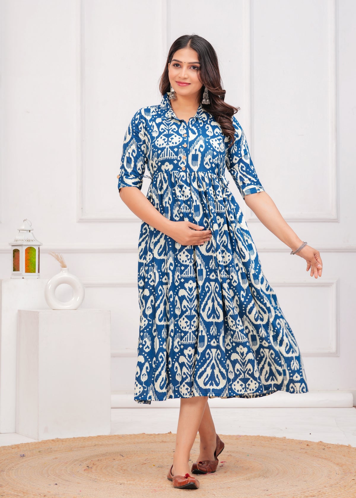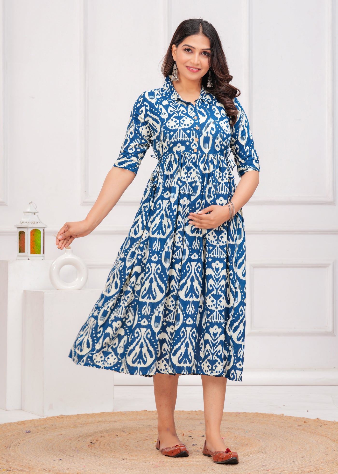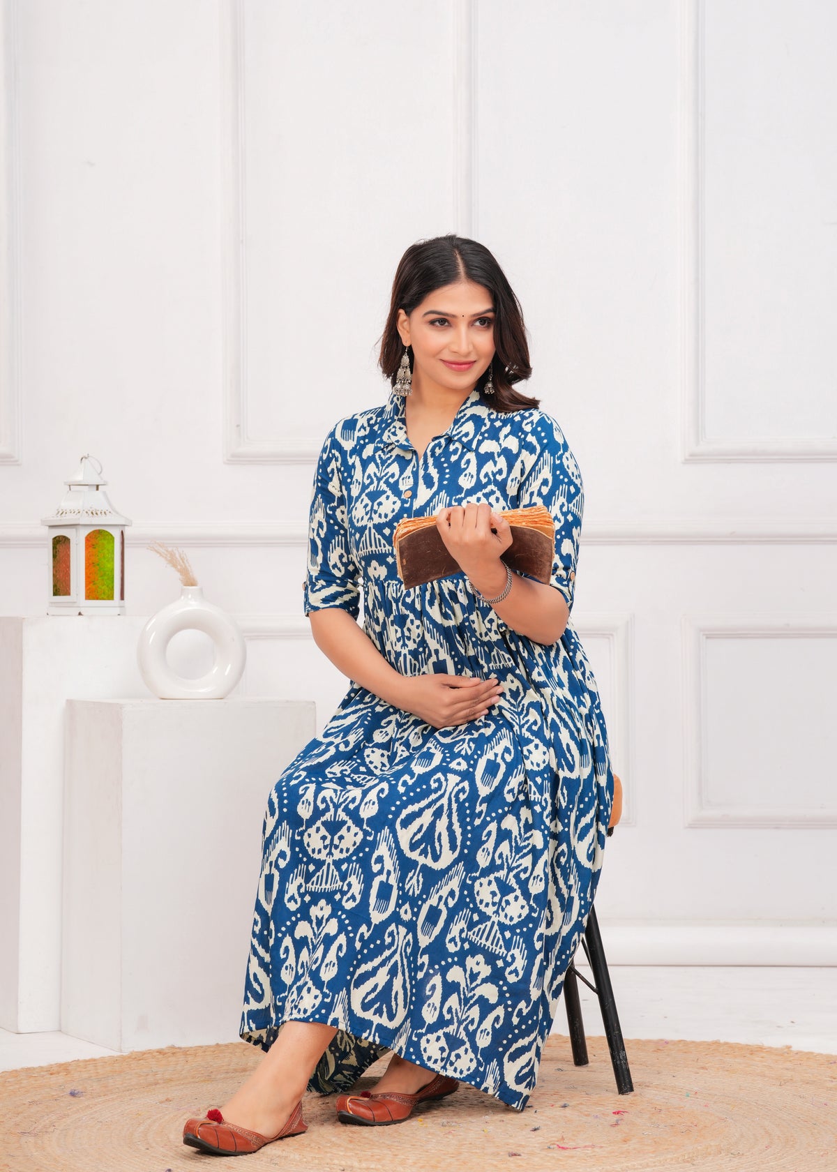 Blue Printed Pure Rayon Cotton Collor Maternity And Feeding Kurta