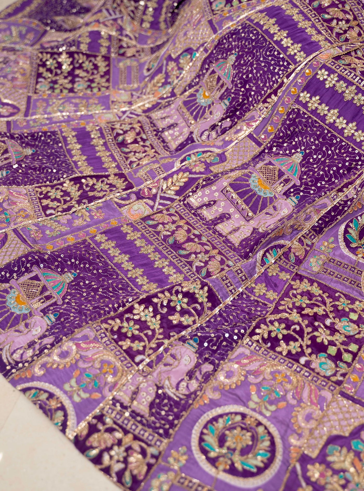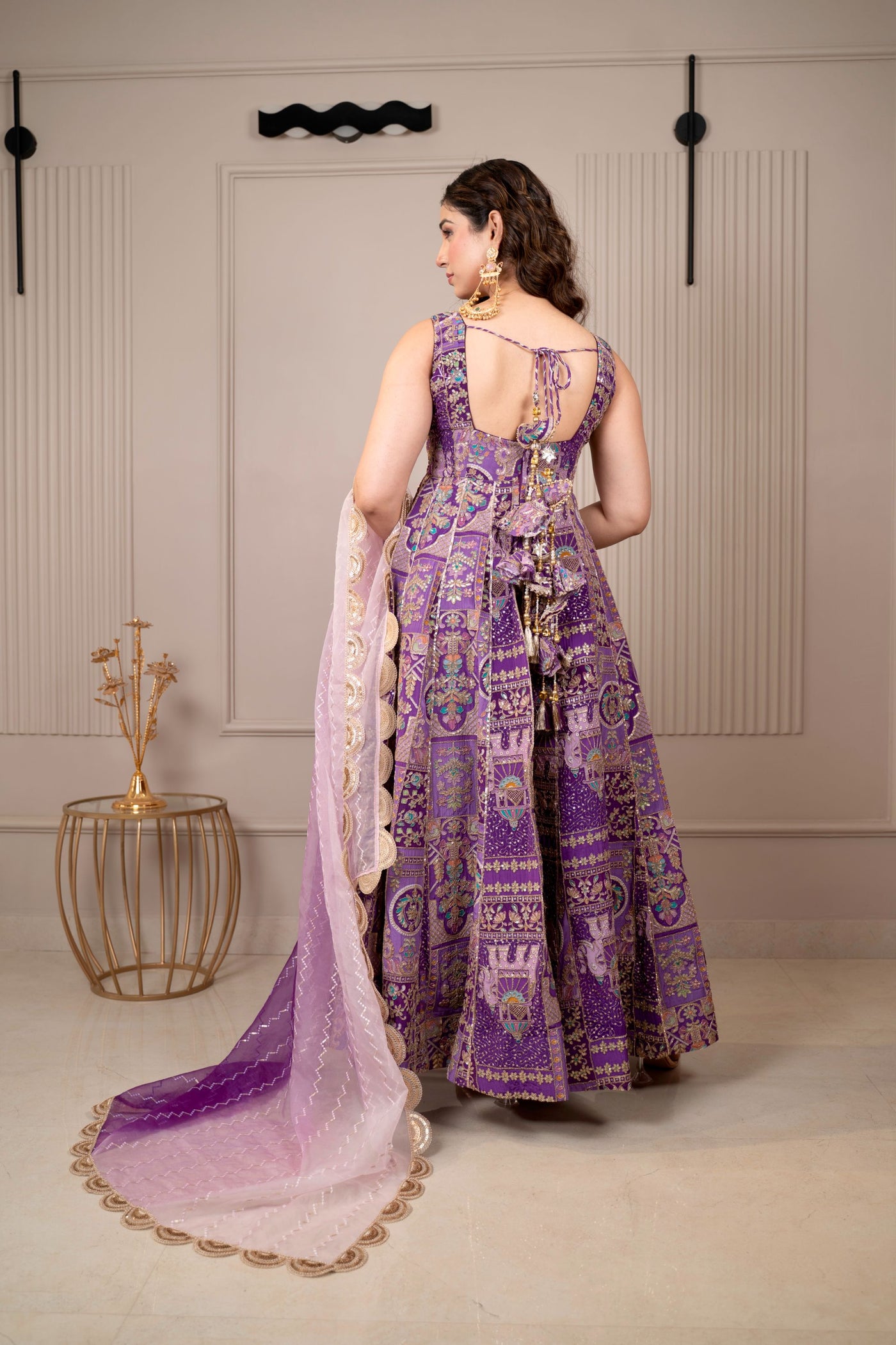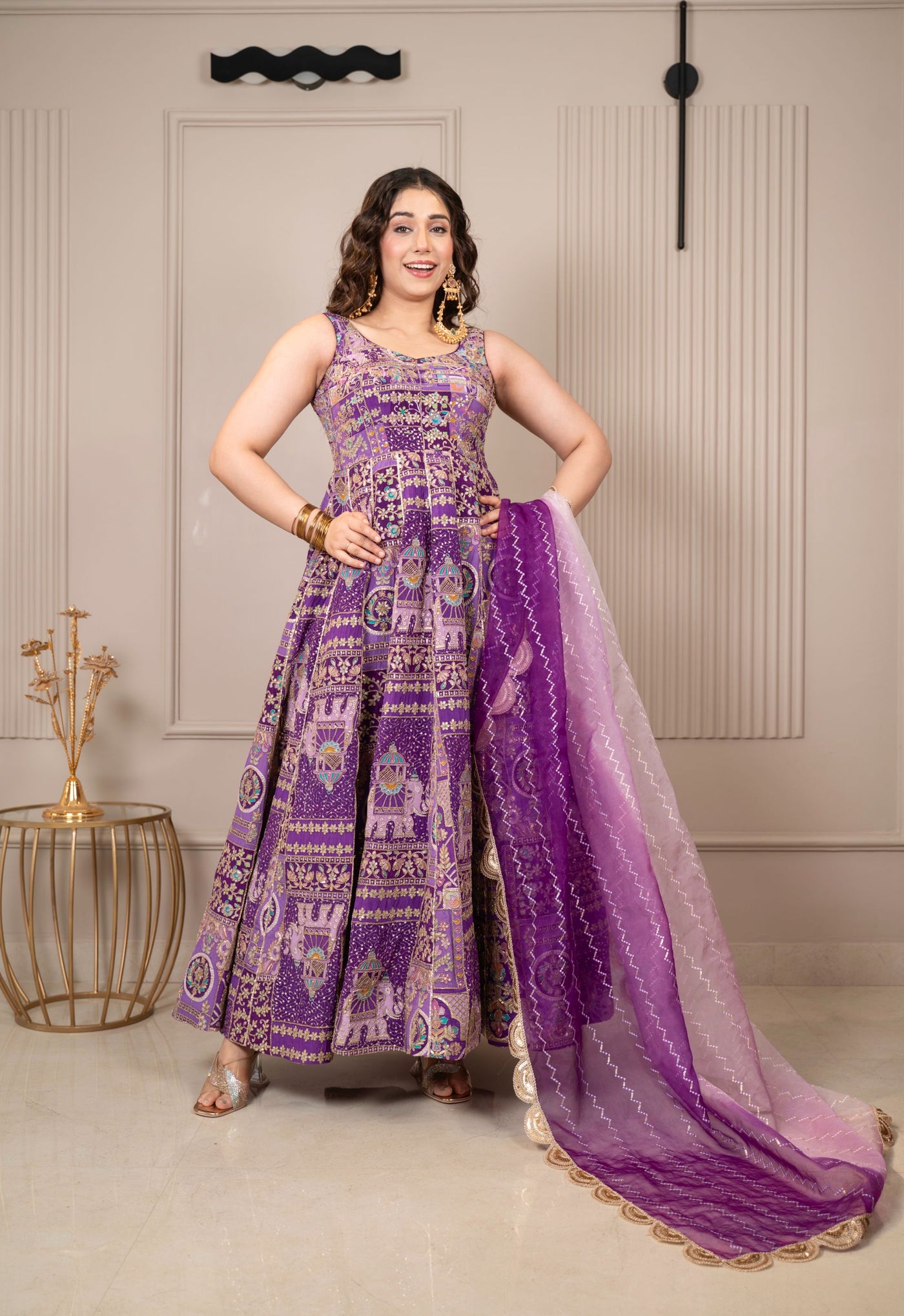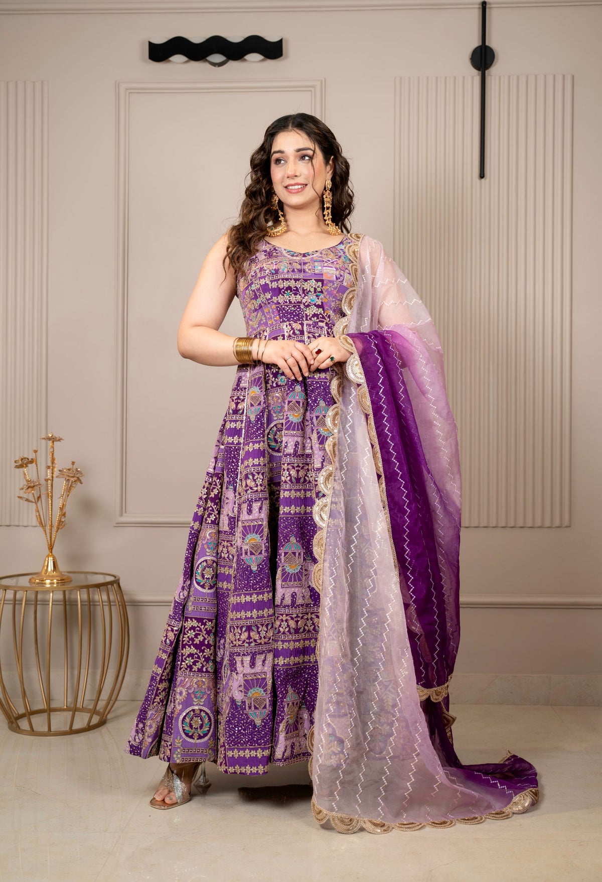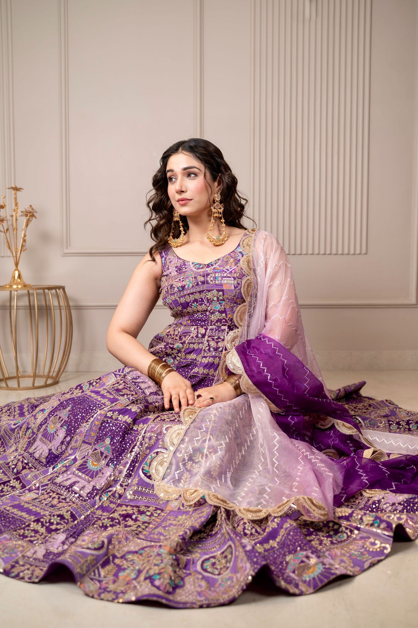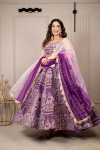 Fashion4word Luxe Patola Silk Flare Dress Set with Elegant Zari Dupatta - Purple / S