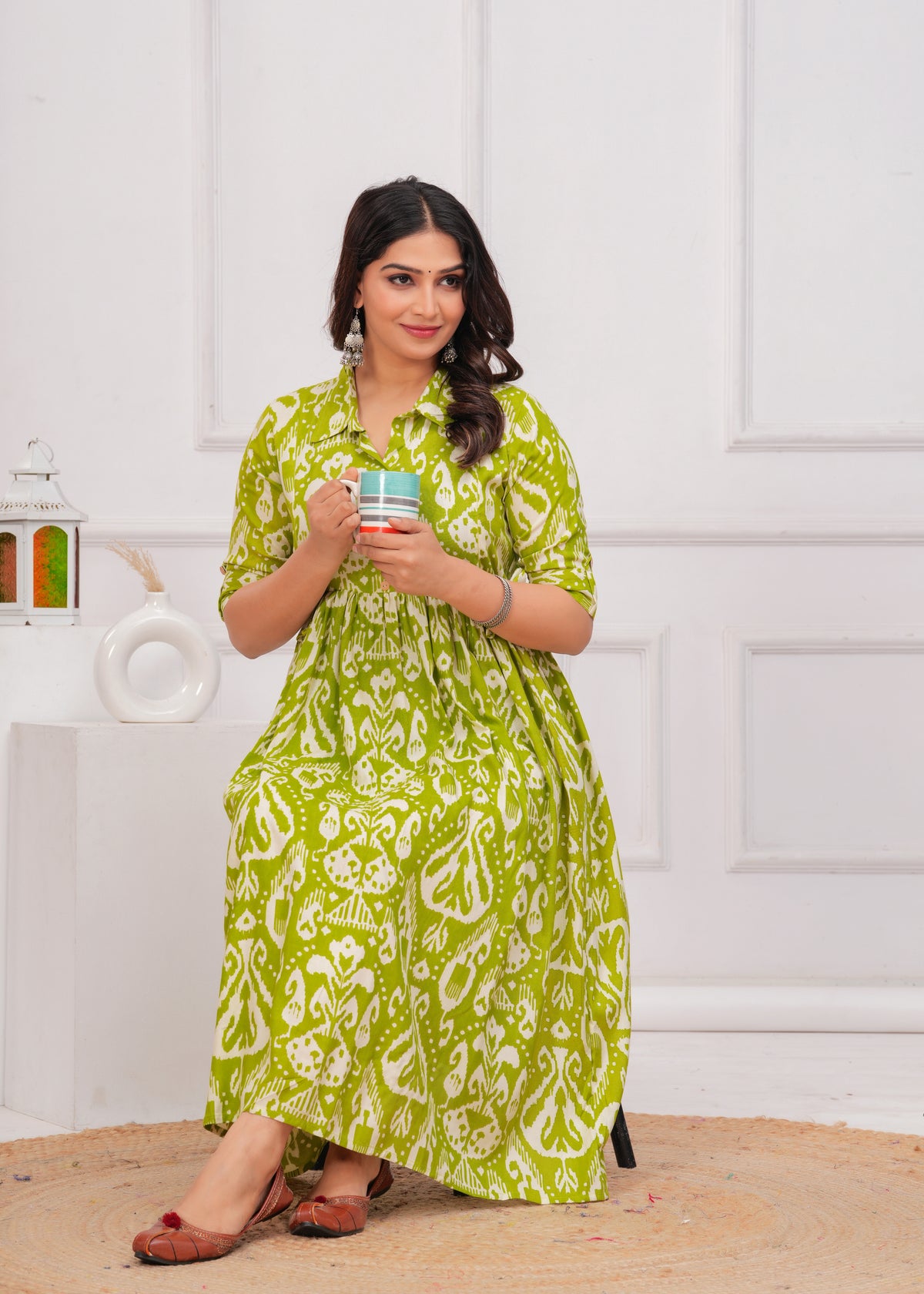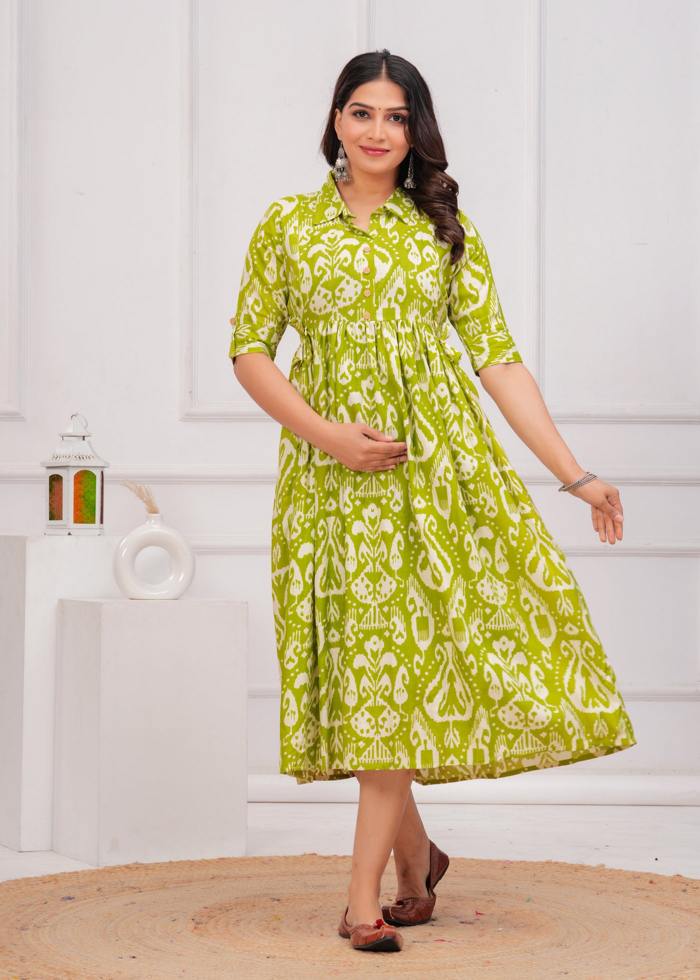 Green Printed Pure Rayon Cotton Collor Maternity And Feeding Kurta