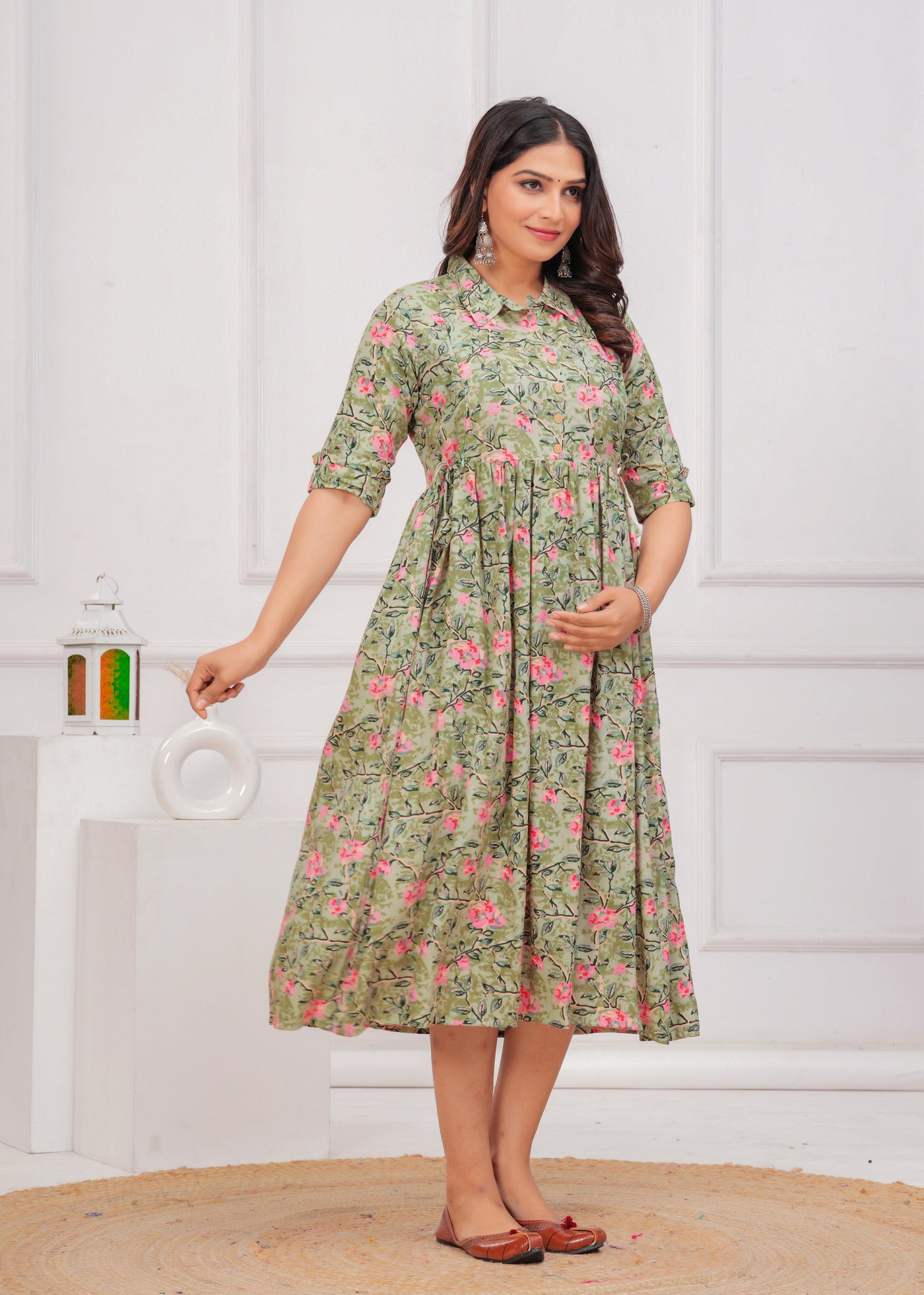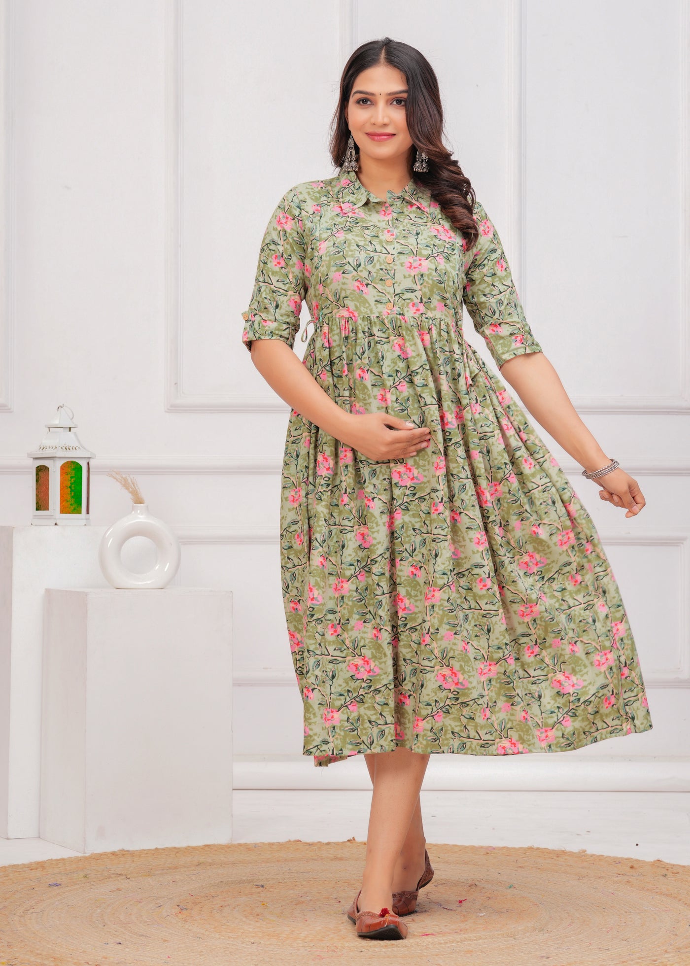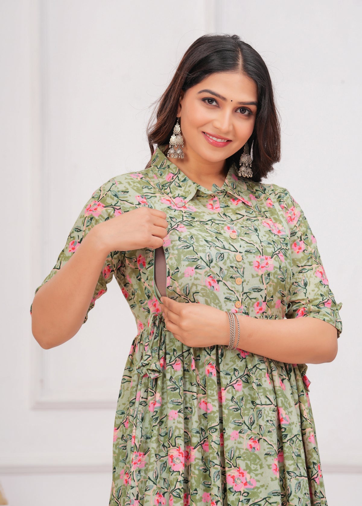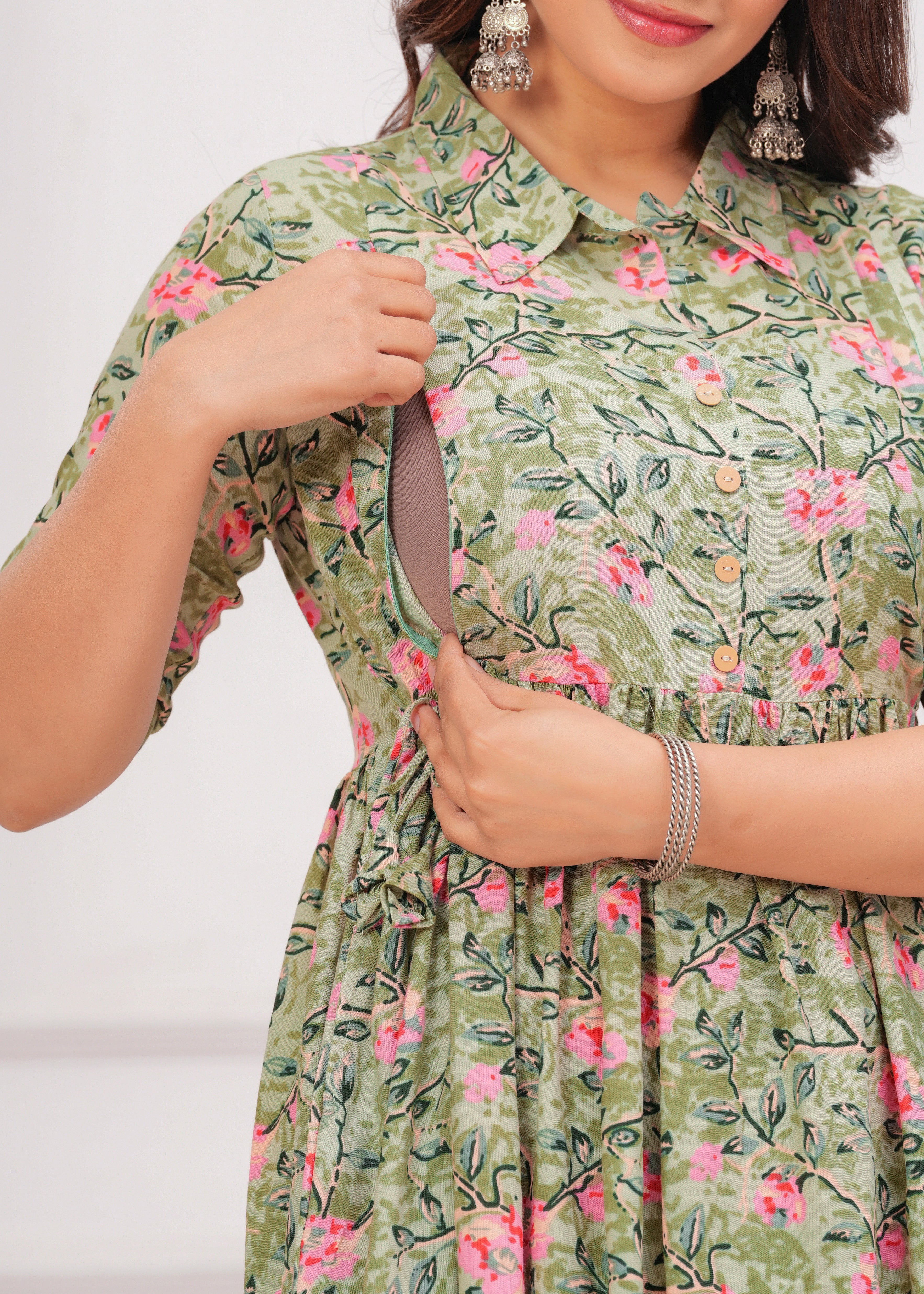 Pista Green Printed Pure Rayon Cotton Collor Maternity And Feeding Kurta - S / Pista Green