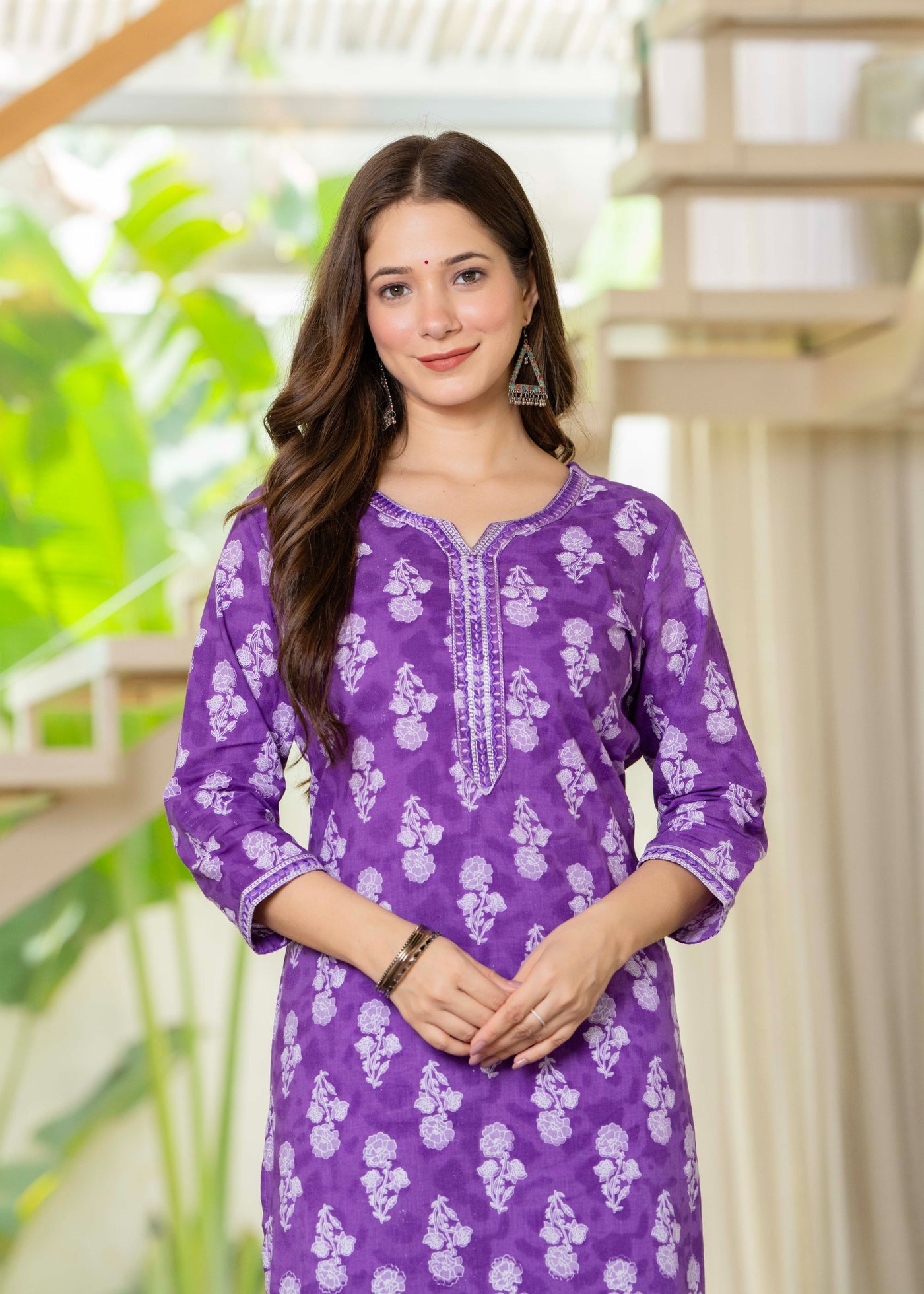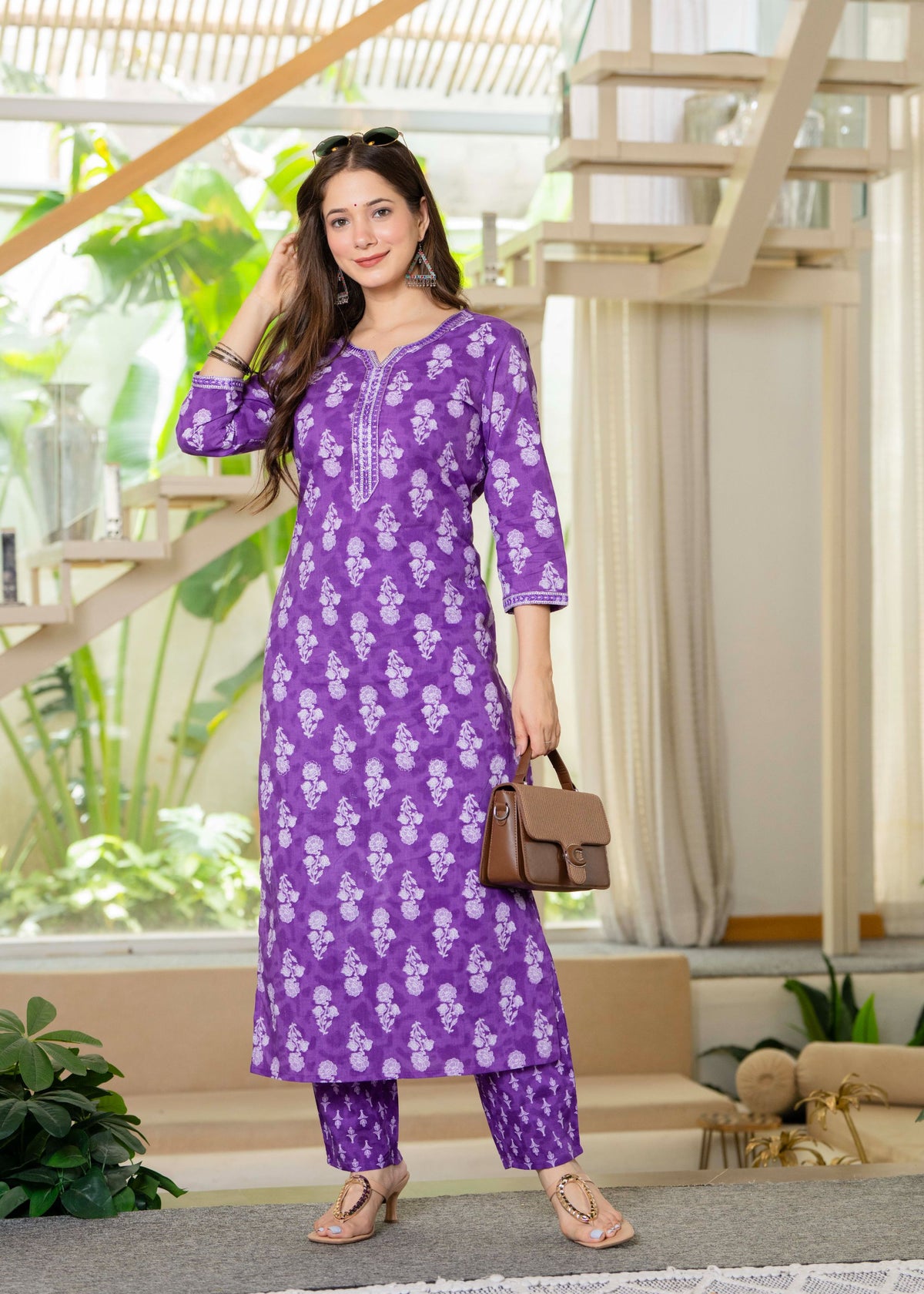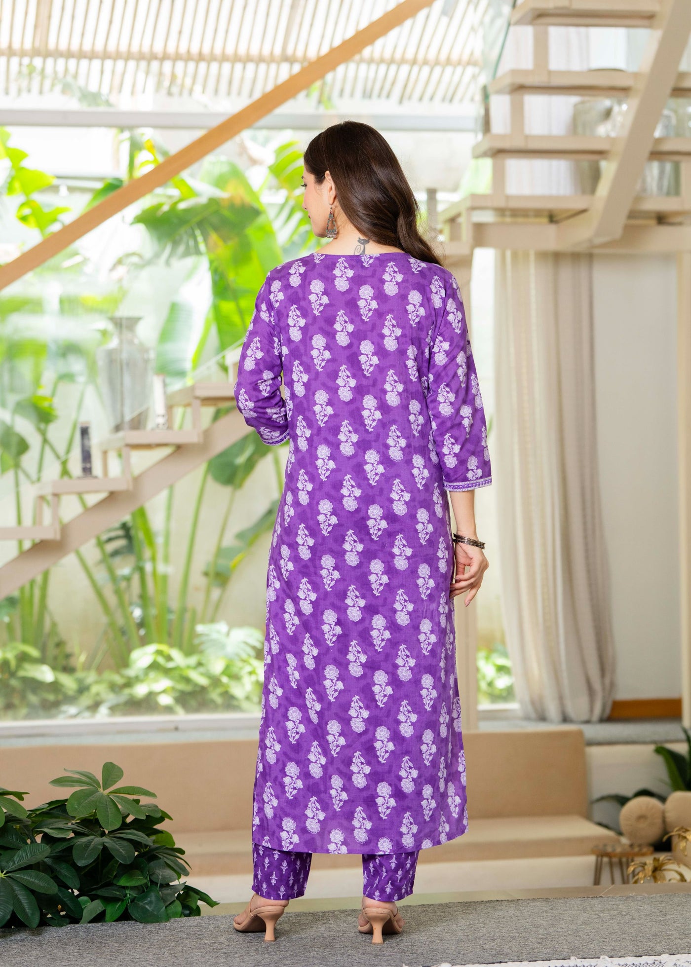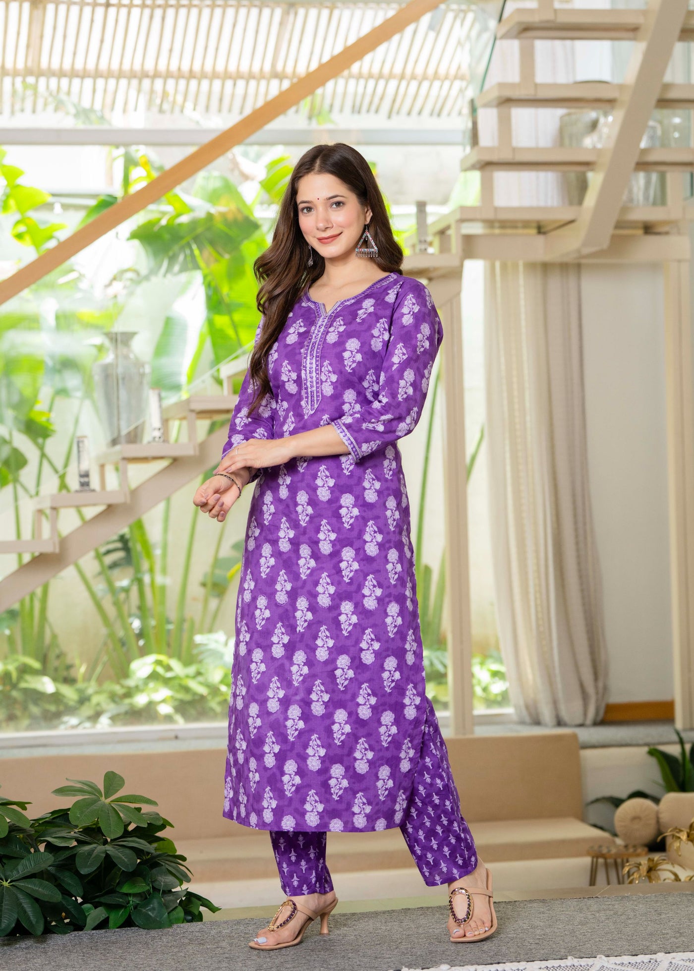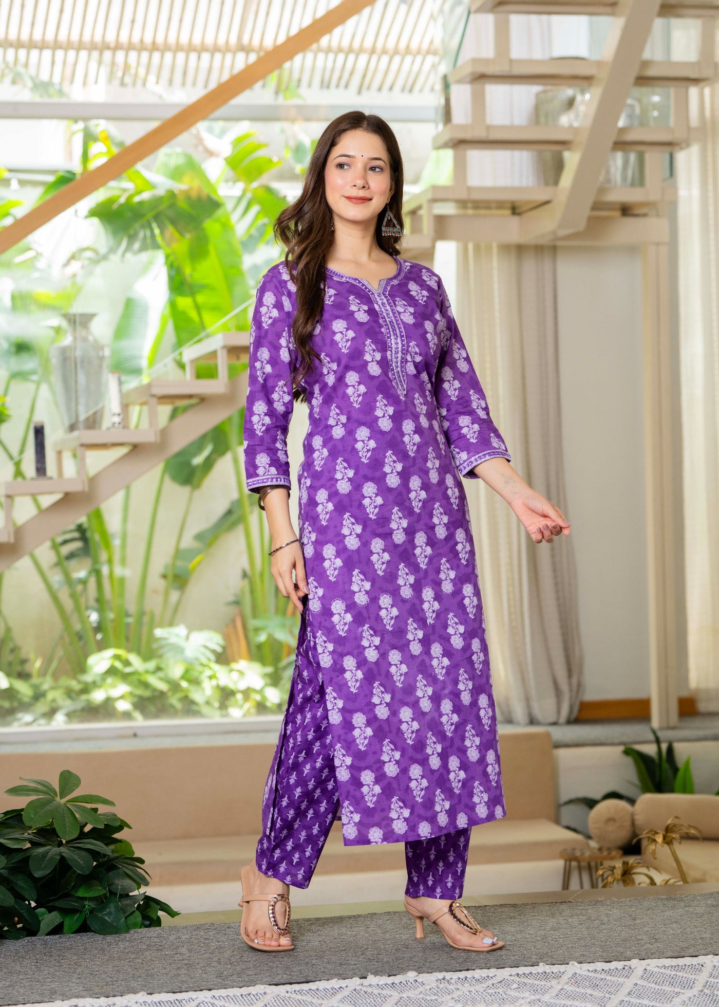 Purple Ethnic Printed Round Neck Pure Cotton Kurta with Pant