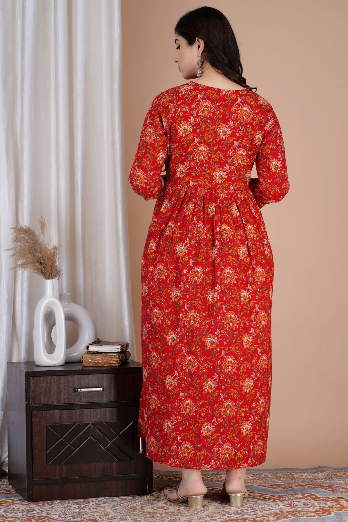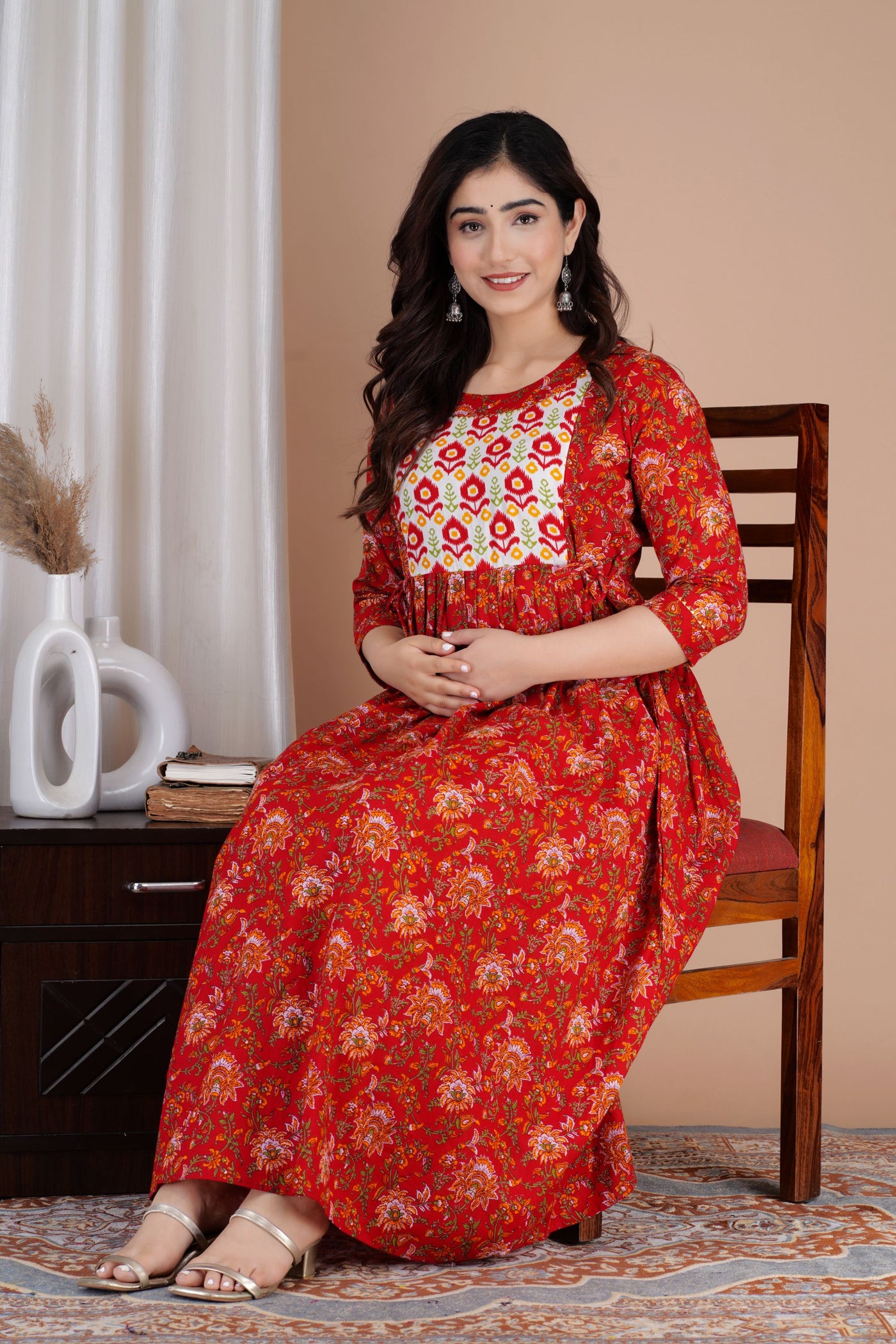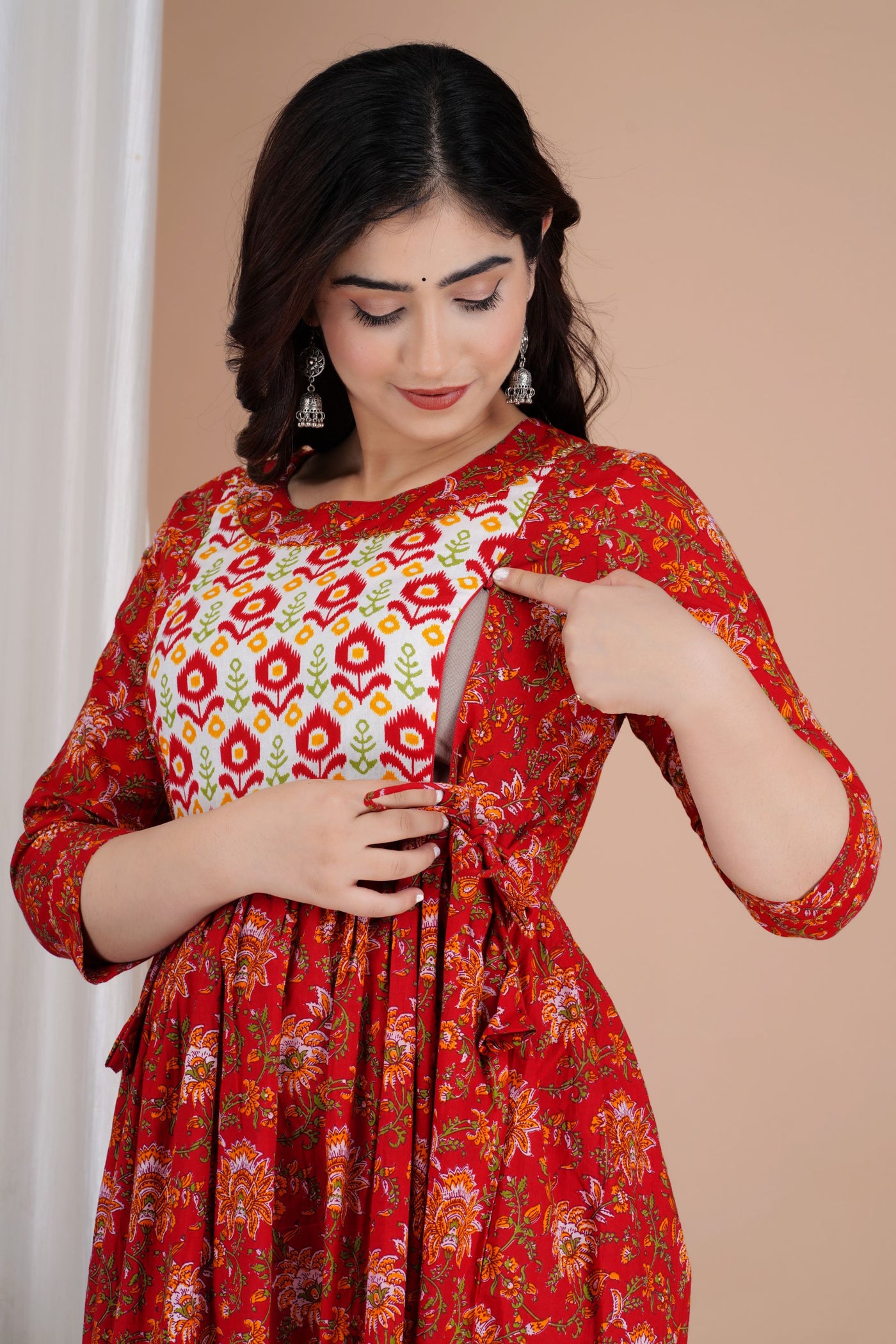 Red Printed Pure Rayon Mateniry And Feeding Kurta