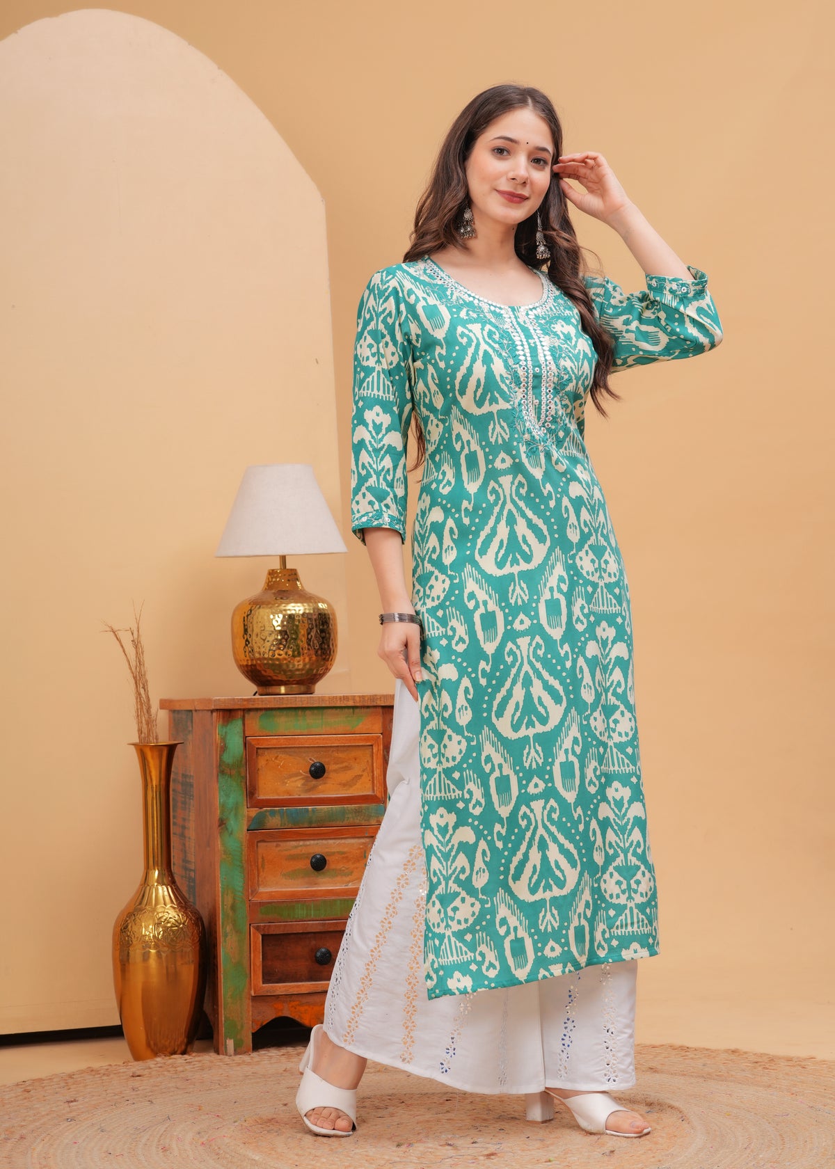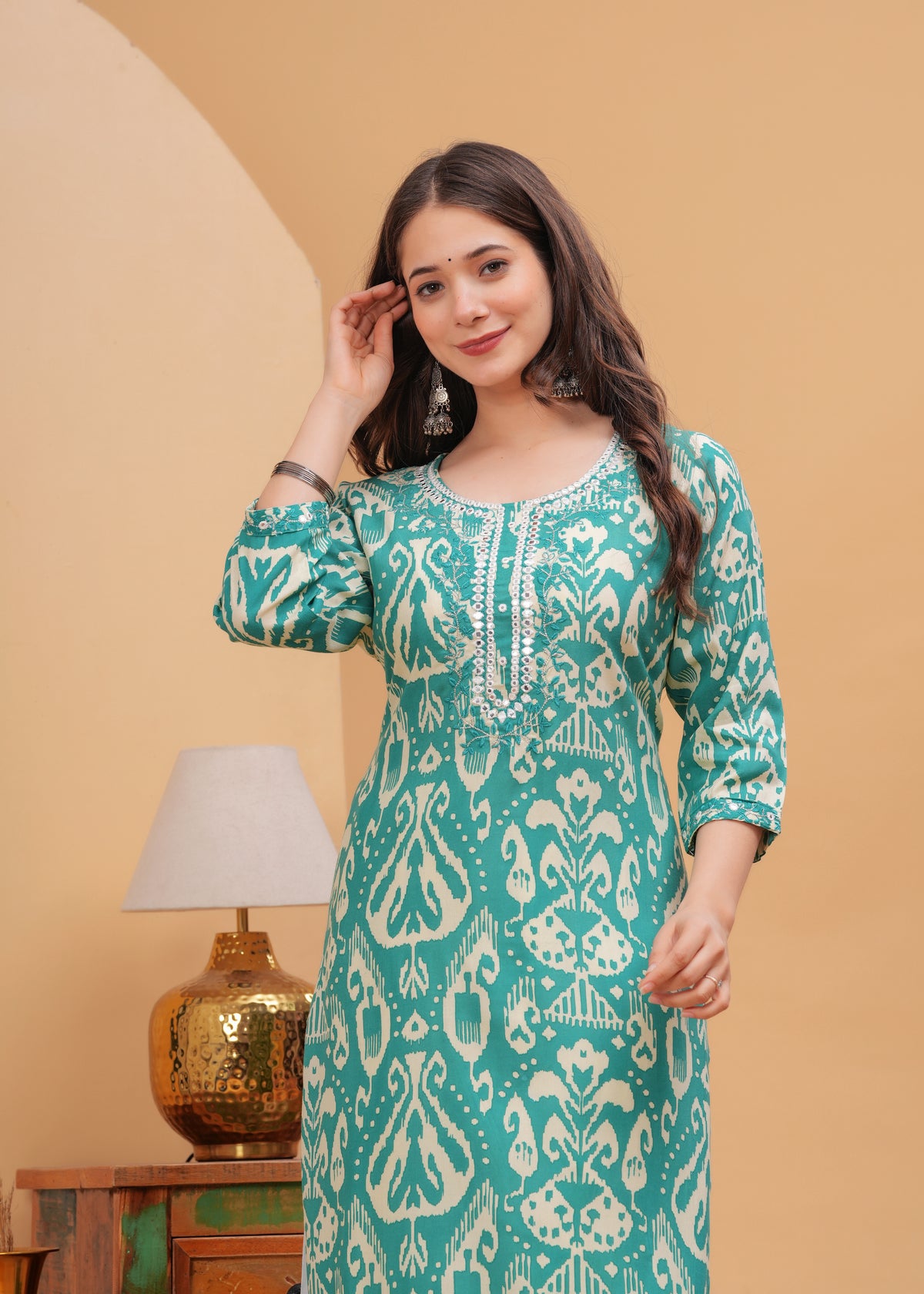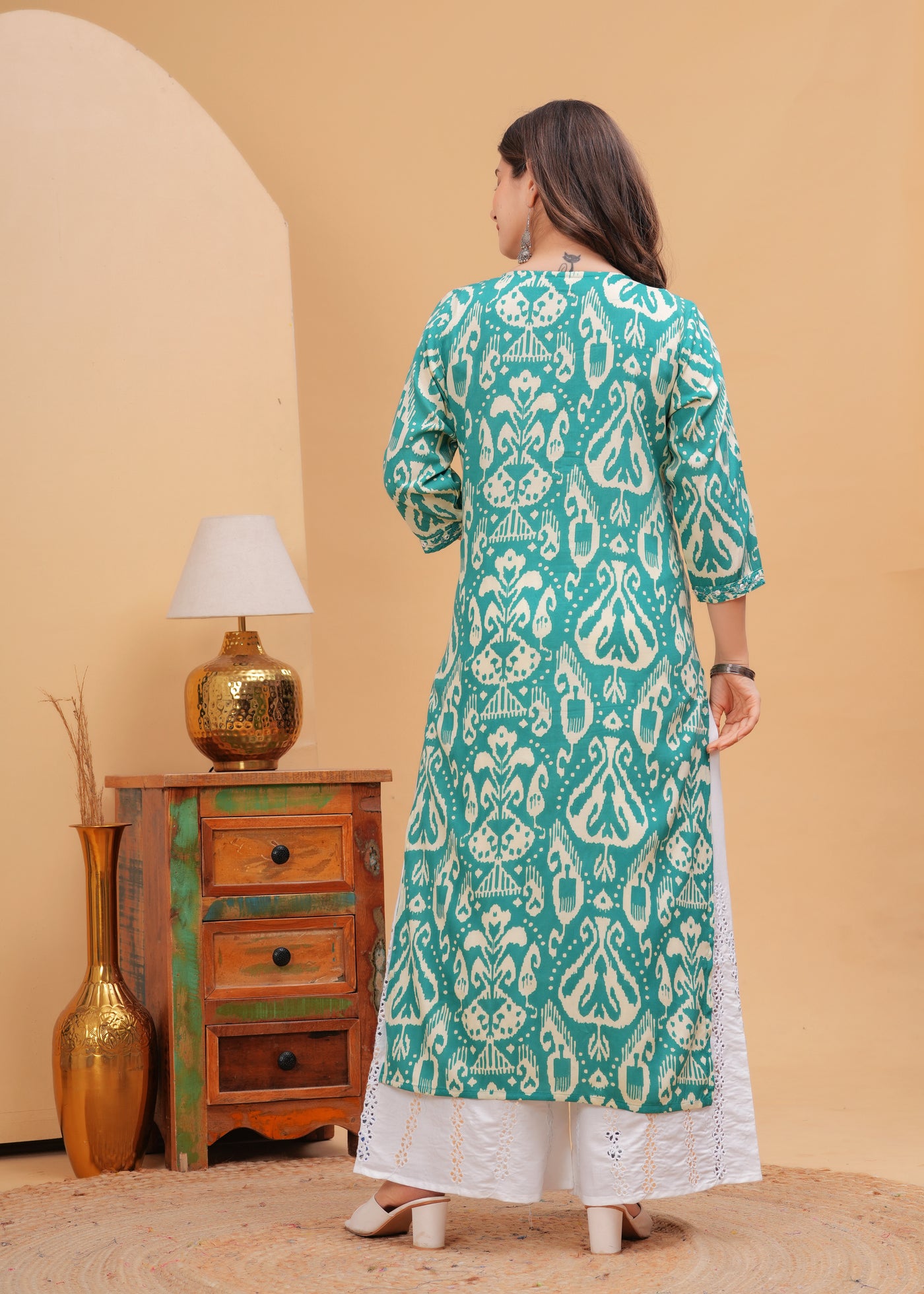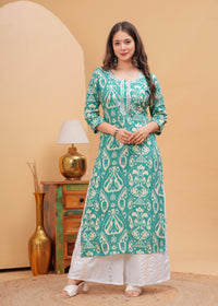 Turquoise Blue Ethnic Printed Round Neck Pure Cotton Kurta