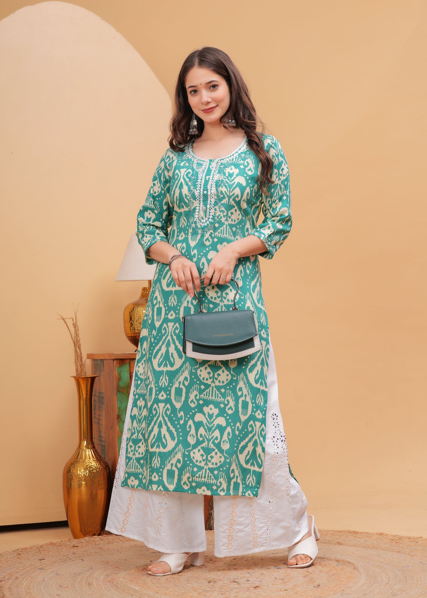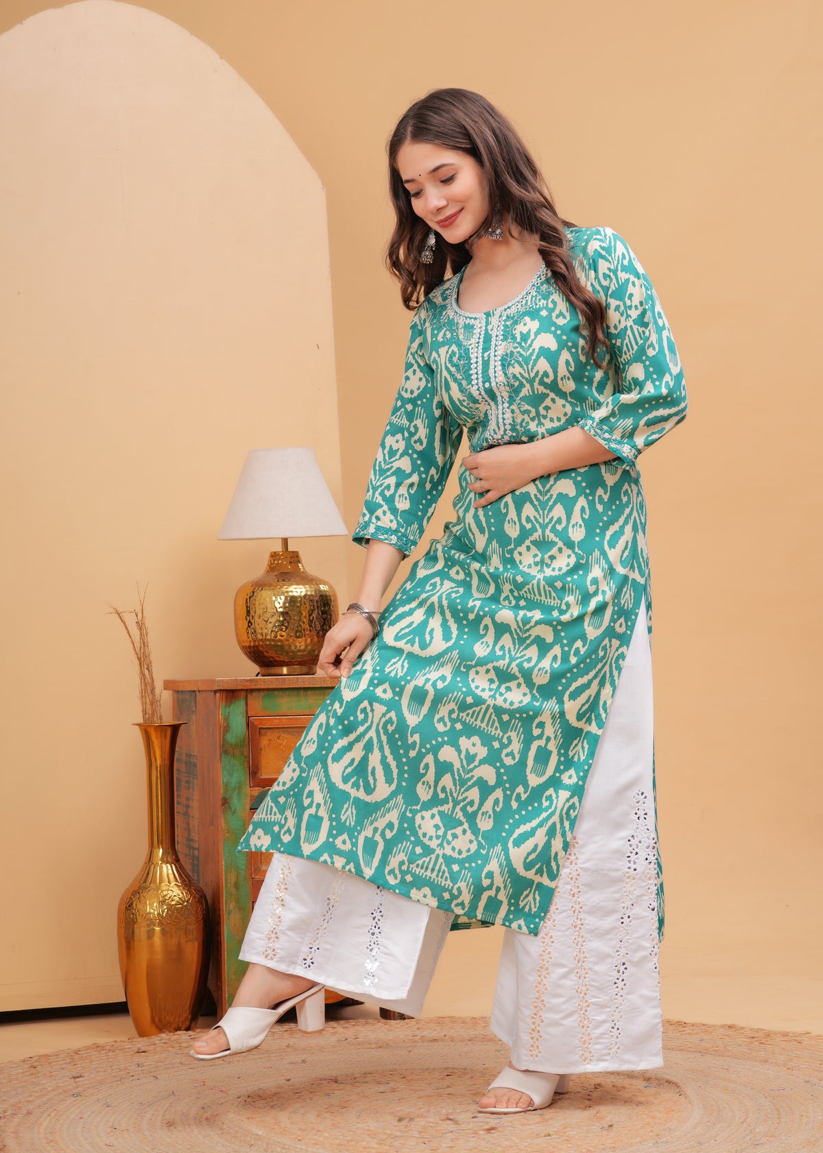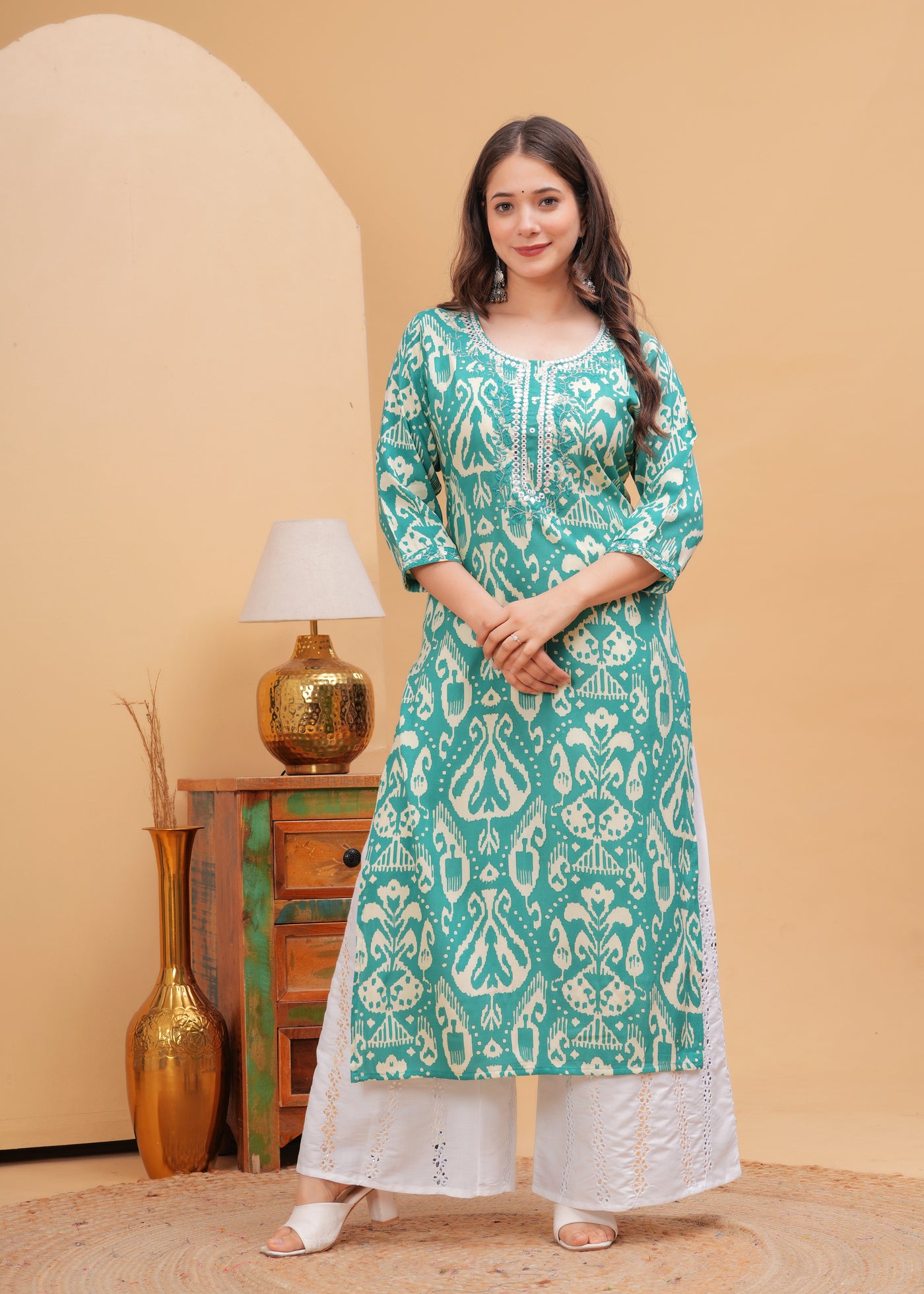 Turquoise Blue Ethnic Printed Round Neck Pure Cotton Kurta