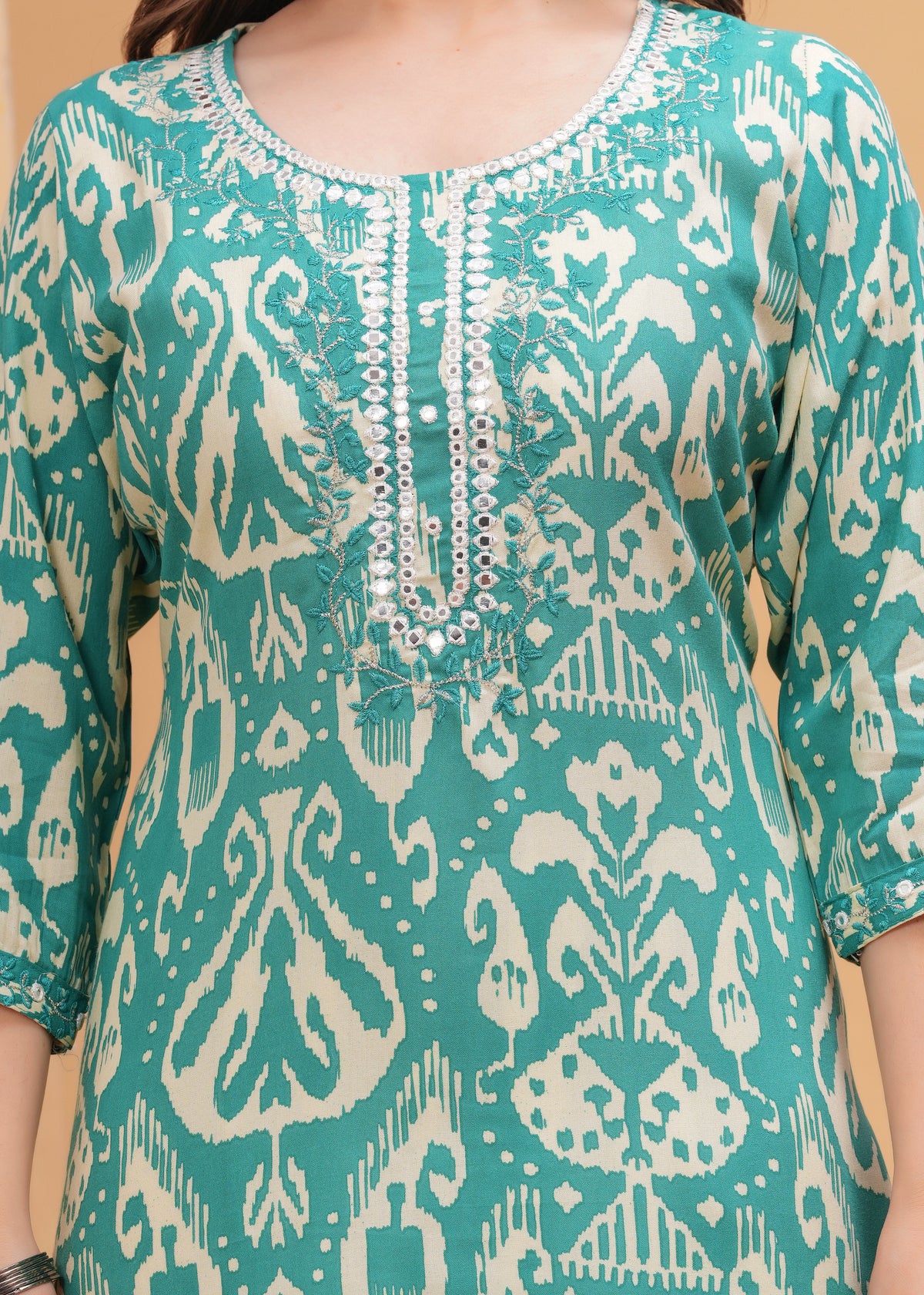 Turquoise Blue Ethnic Printed Round Neck Pure Cotton Kurta - Turquoise Blue / S