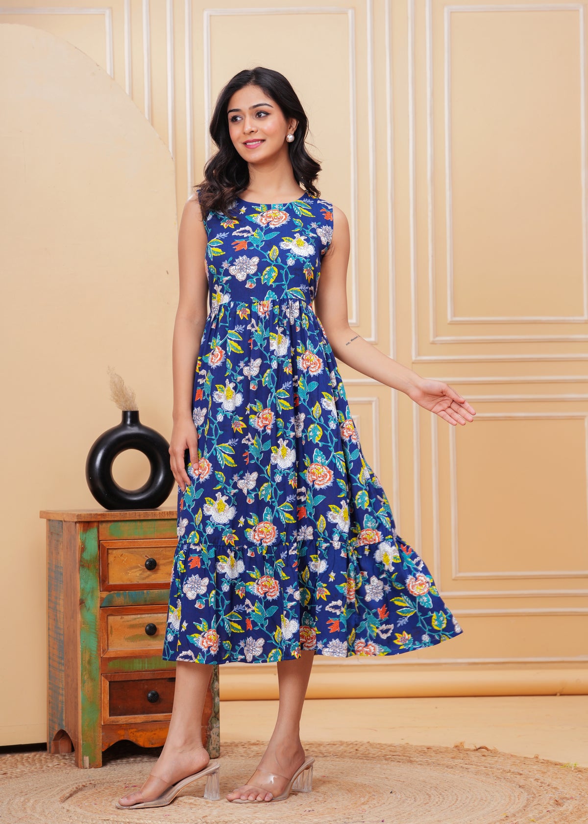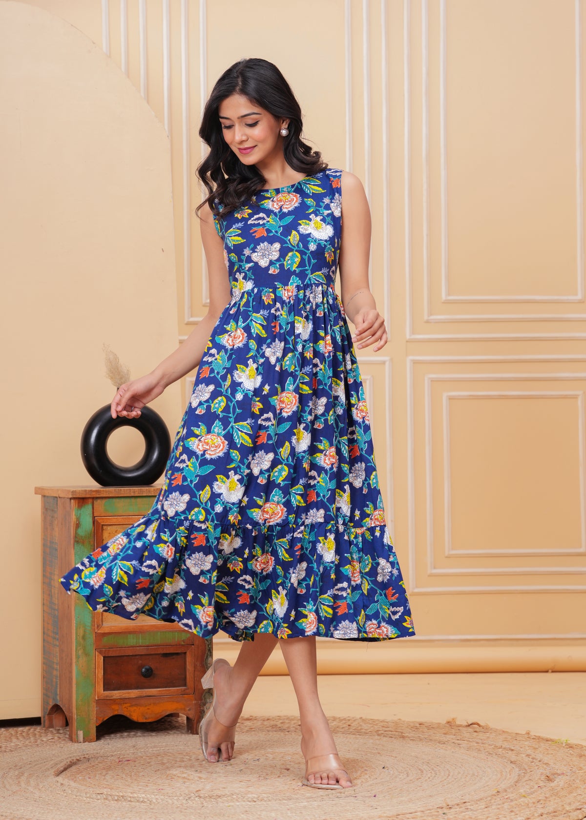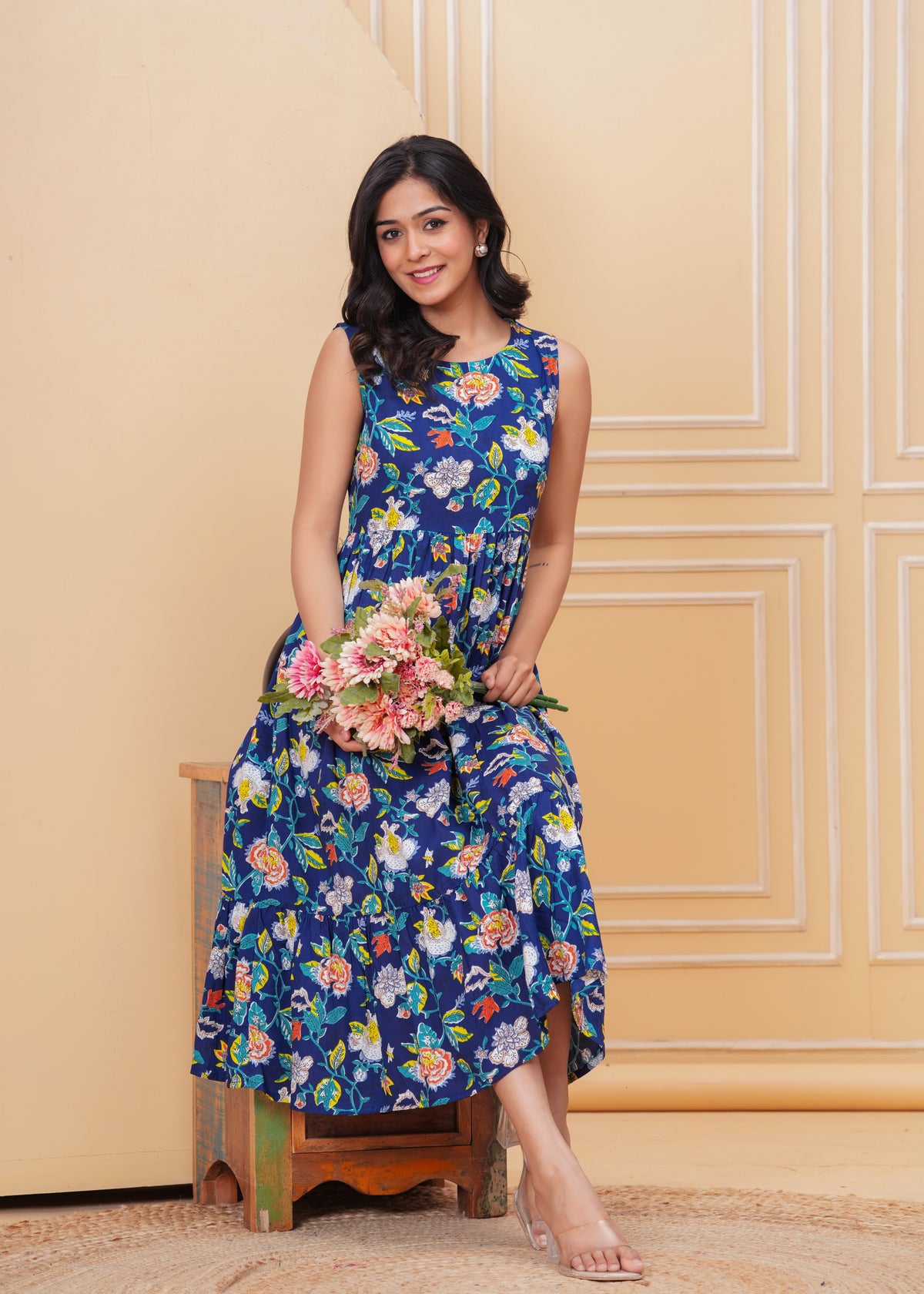 Women’s Blue Ikat Sleeveless Flared Dress