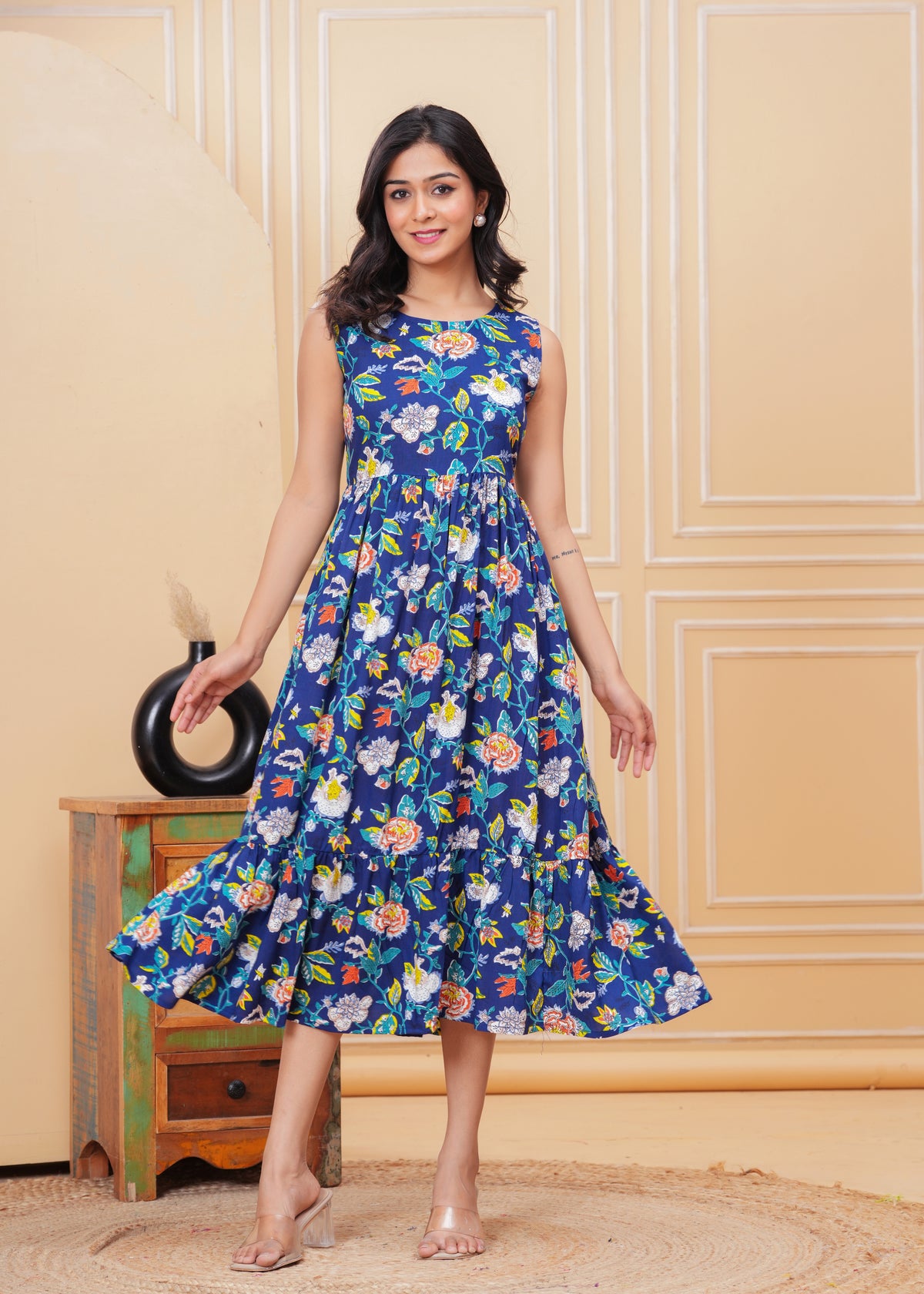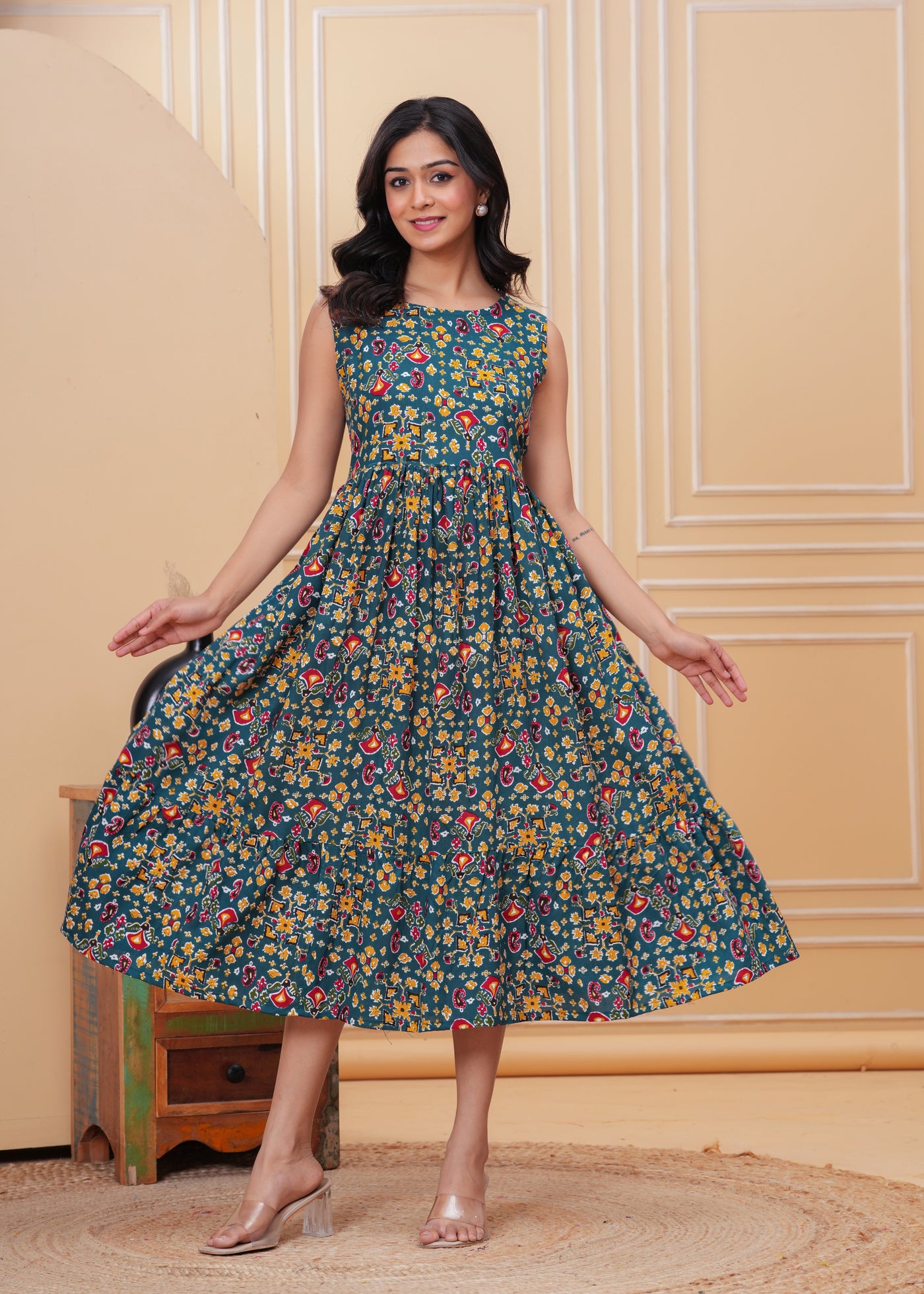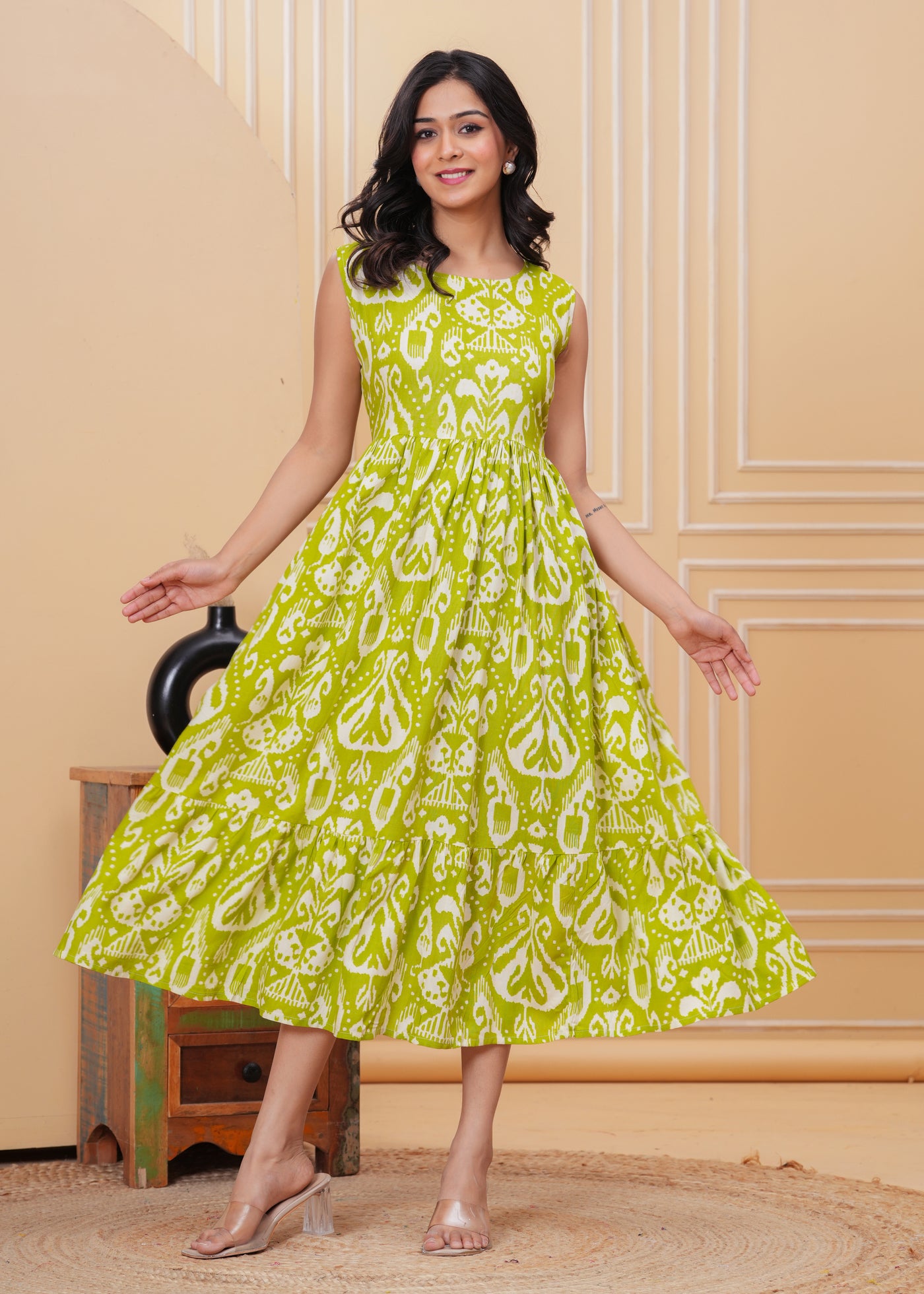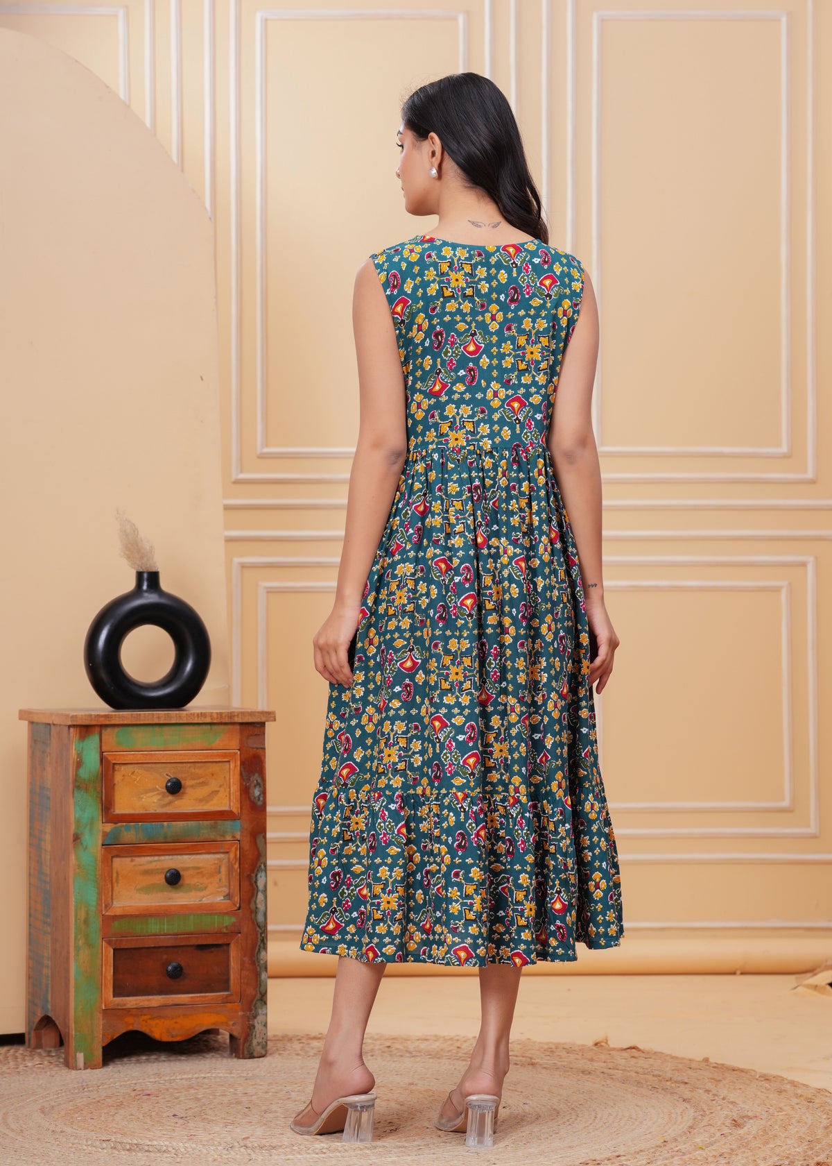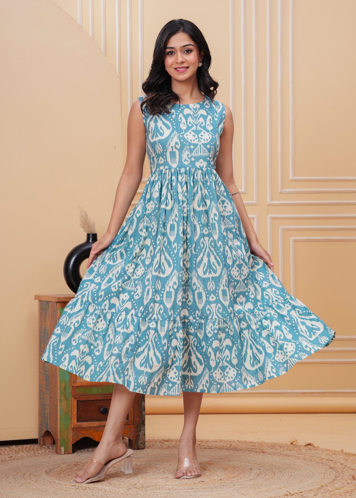 Women’s Teal Blue Ikat Sleeveless Flared Dress