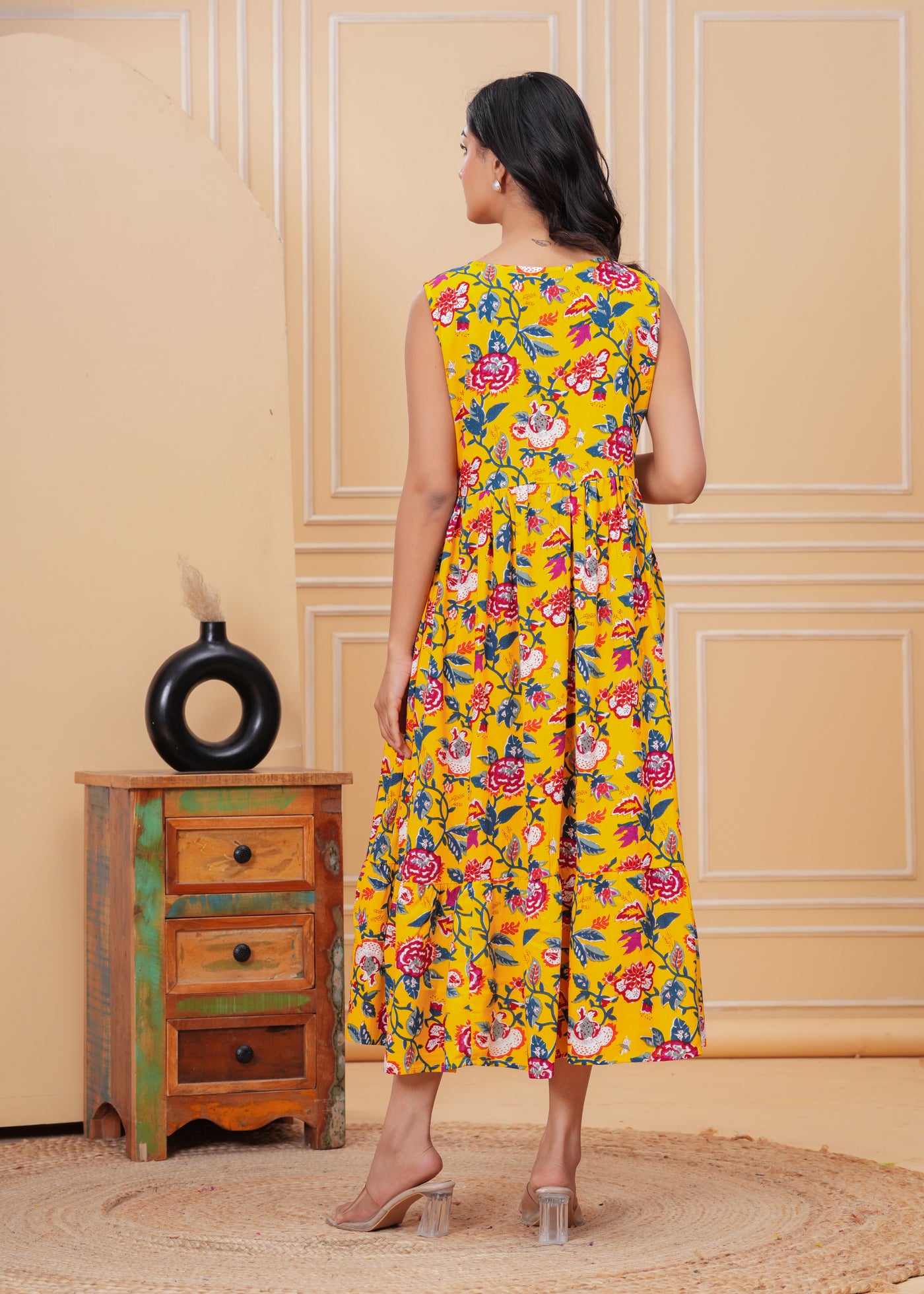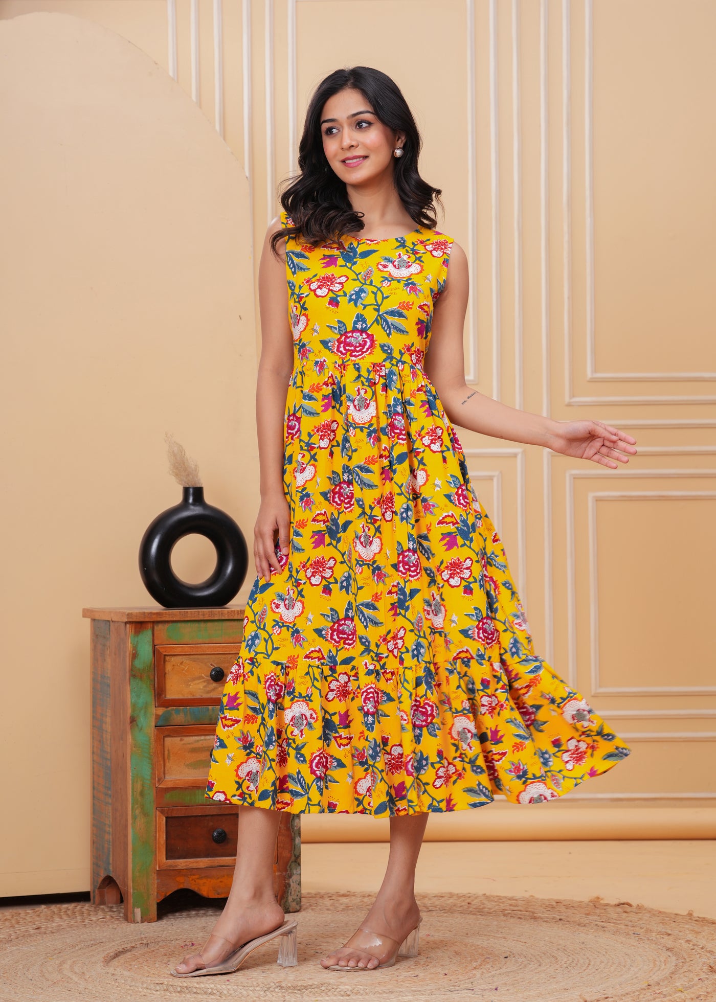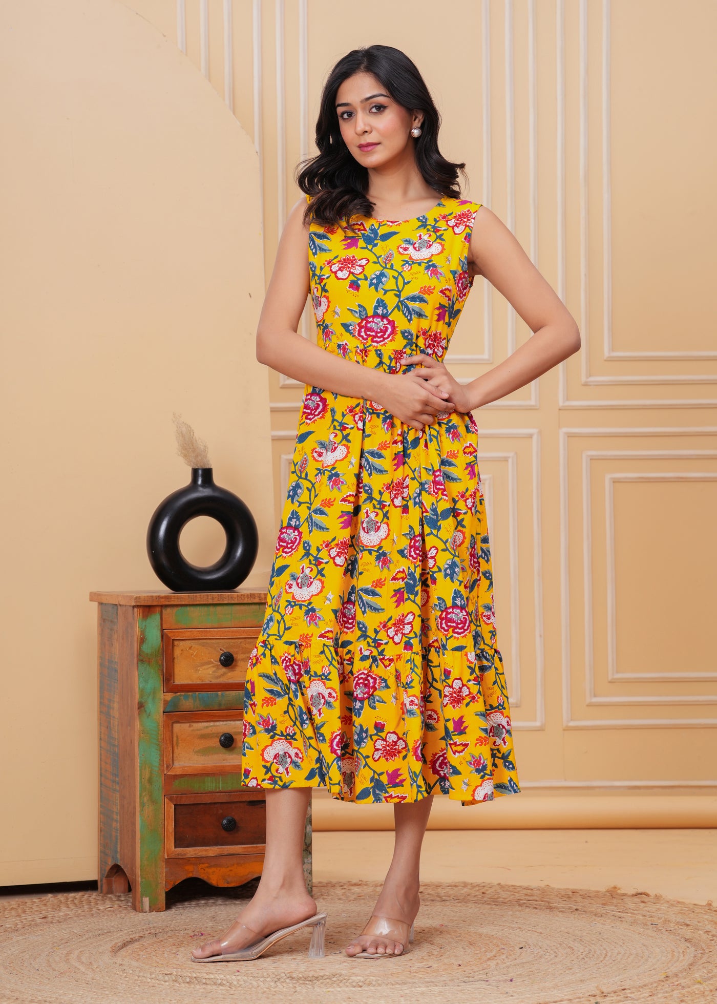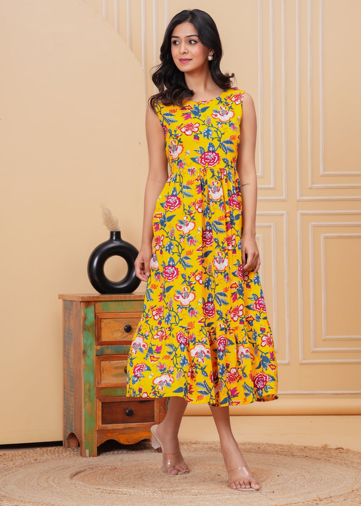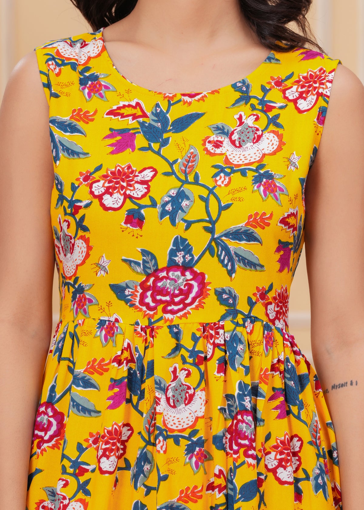 Women’s Yellow Ikat Sleeveless Flared Dress